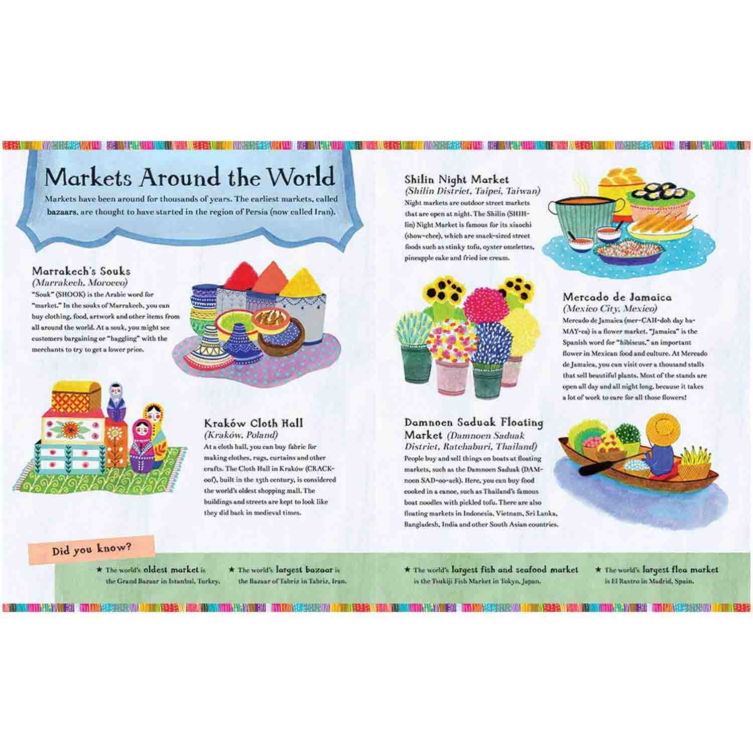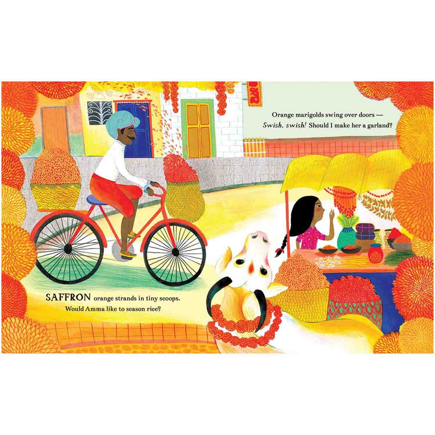 In this book inspired by the author’s hometown of Chennai, India, a girl explores the vibrant rainbow of delights in a southern Indian street market as she searches for a gift for her amma (mother). Endnotes explain all the items on sale and introduce readers to markets around the world.