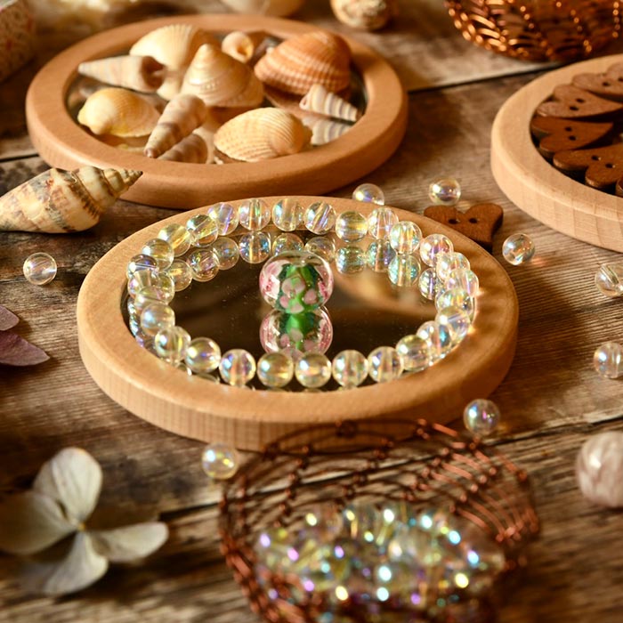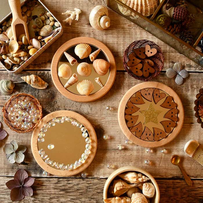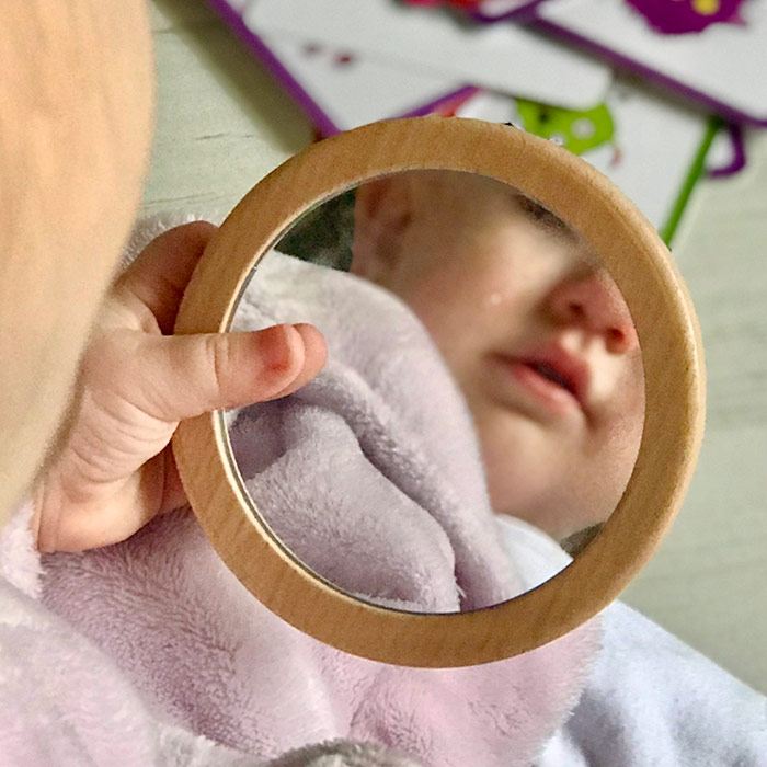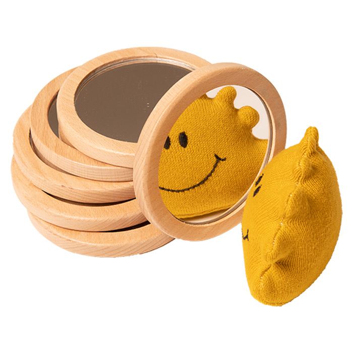 Little Looking Mirrors include six 4 inch circular mirrors set in sustainably sourced beech wood frames. Designed for exploring facial expressions, self-awareness, and emotional development. Sized for small hands and safe from 10 months and up. Ideal for early learning and social emotional spaces.