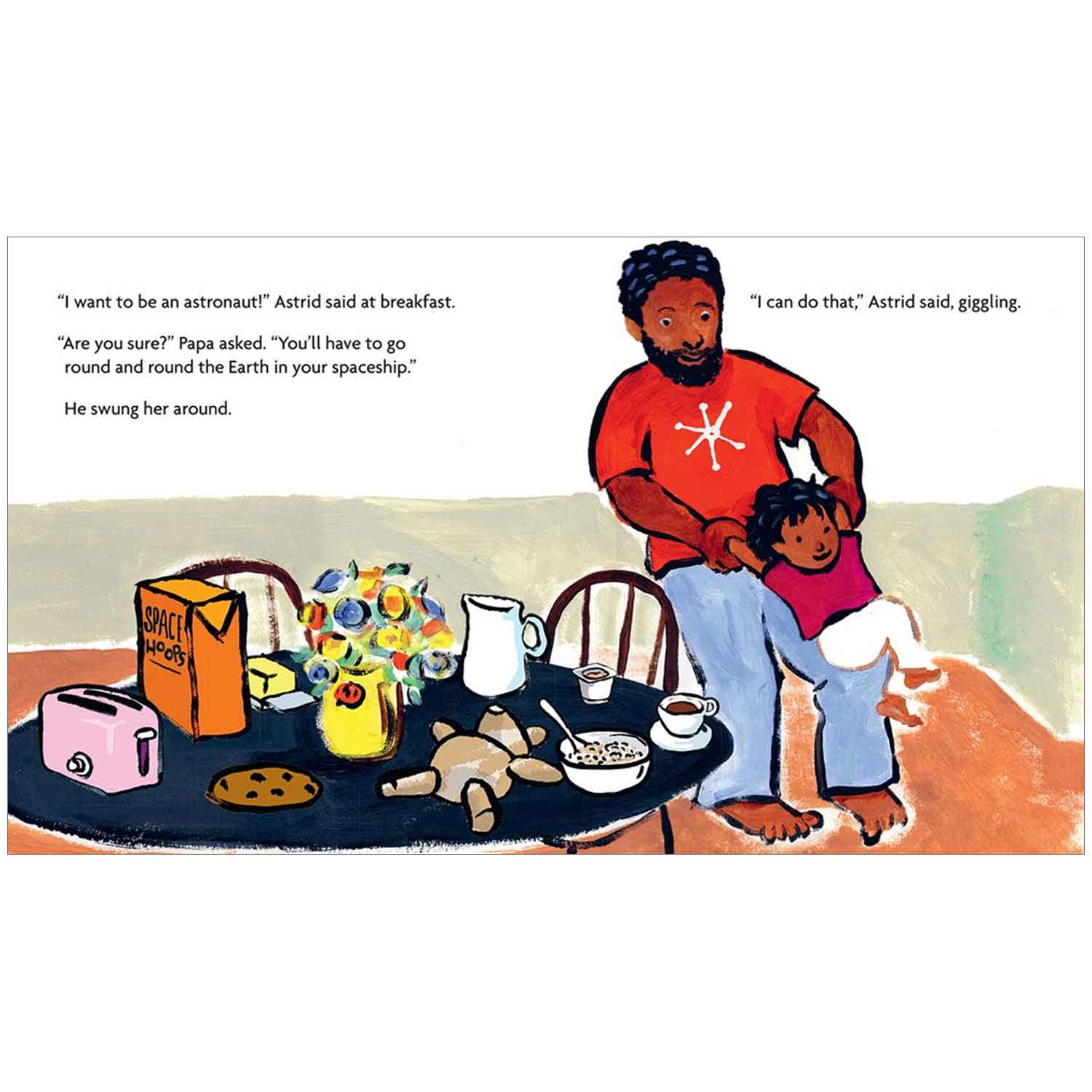 Astrid has loved the stars and space for as long as she can remember. “I want to be an astronaut!” she says to everyone who will listen. While her mama is away, Astrid and her papa have fun acting out the challenges an astronaut faces on a space mission — like being in zero gravity (“I can do that all day long!” she says), eating food from a kind of tube, and doing science experiments with the help of cookie sheets. When at last it’s time to meet Mama at the air base, Astrid wears her favorite space T-shirt to greet her. But where exactly has Mama been?