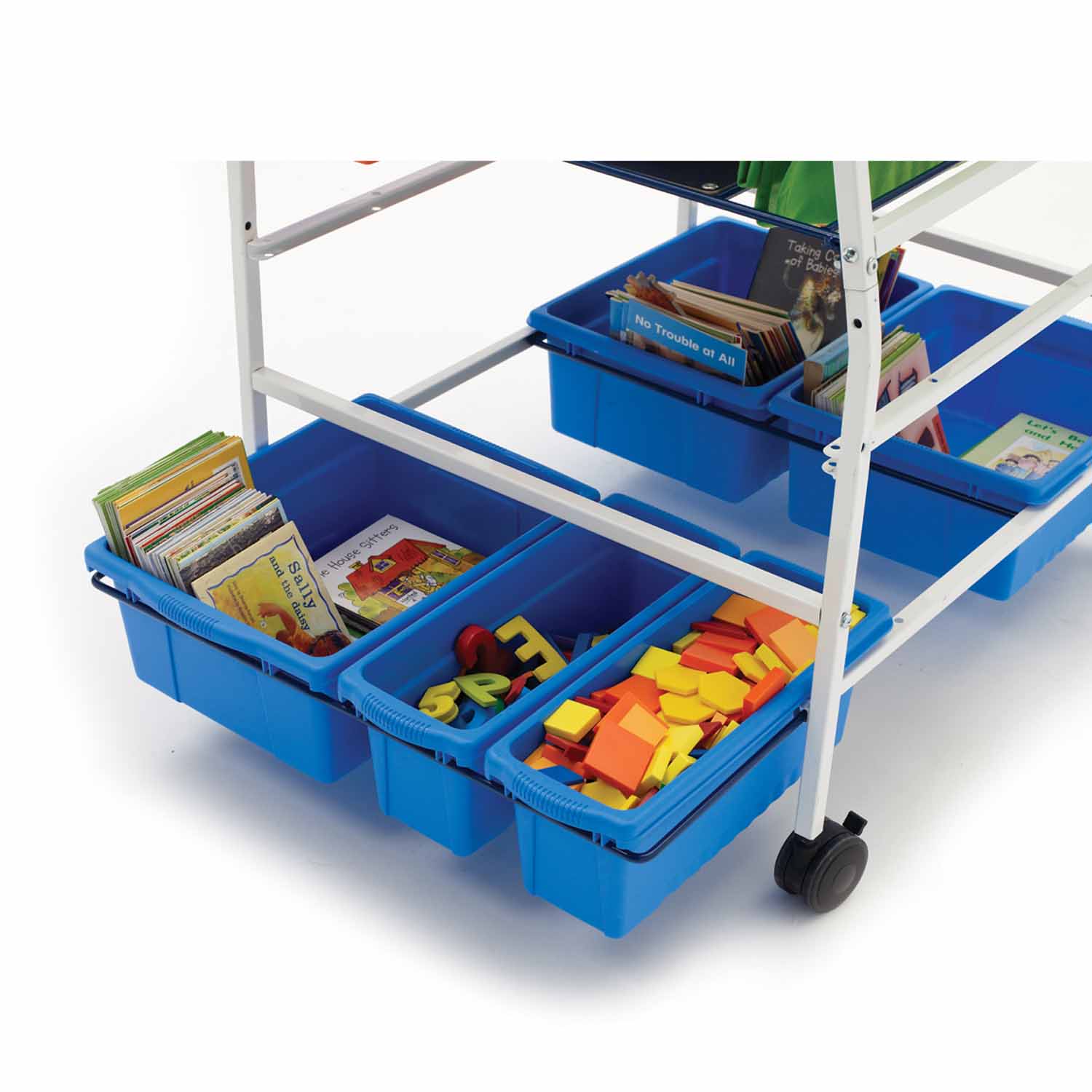 This easel features the quality build of our teaching centers with an attractive price point for tight budgets. Small and open tubs can be positioned on the upper or lower level to accommodate various sized teaching manipulatives. Features a front magnetic dry-erase surface, book ledge that locks into position and 3" twin wheel locking casters.