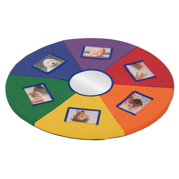 This fun and cozy photo play mat creates an engaging and comfortable play space for infants and young toddlers. Featuring six clear pockets to display familiar pictures to offer visual stimulation and encourage exploration. In the center, a flexible, safe mirror captures babies' attention while promoting sensory development. Perfectly sized to fit in any classroom or play area, Peek and Crawl Circle is ideal for both non-mobile and mobile infants, providing a soft space for quiet play and discovery.
