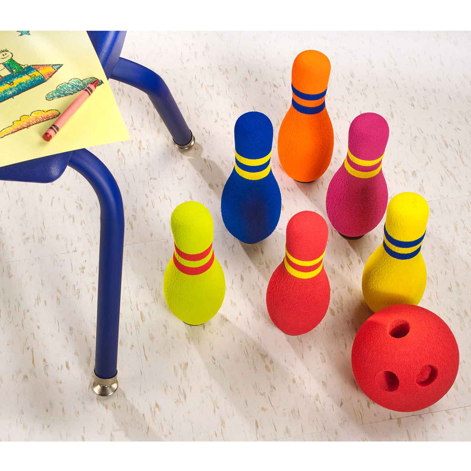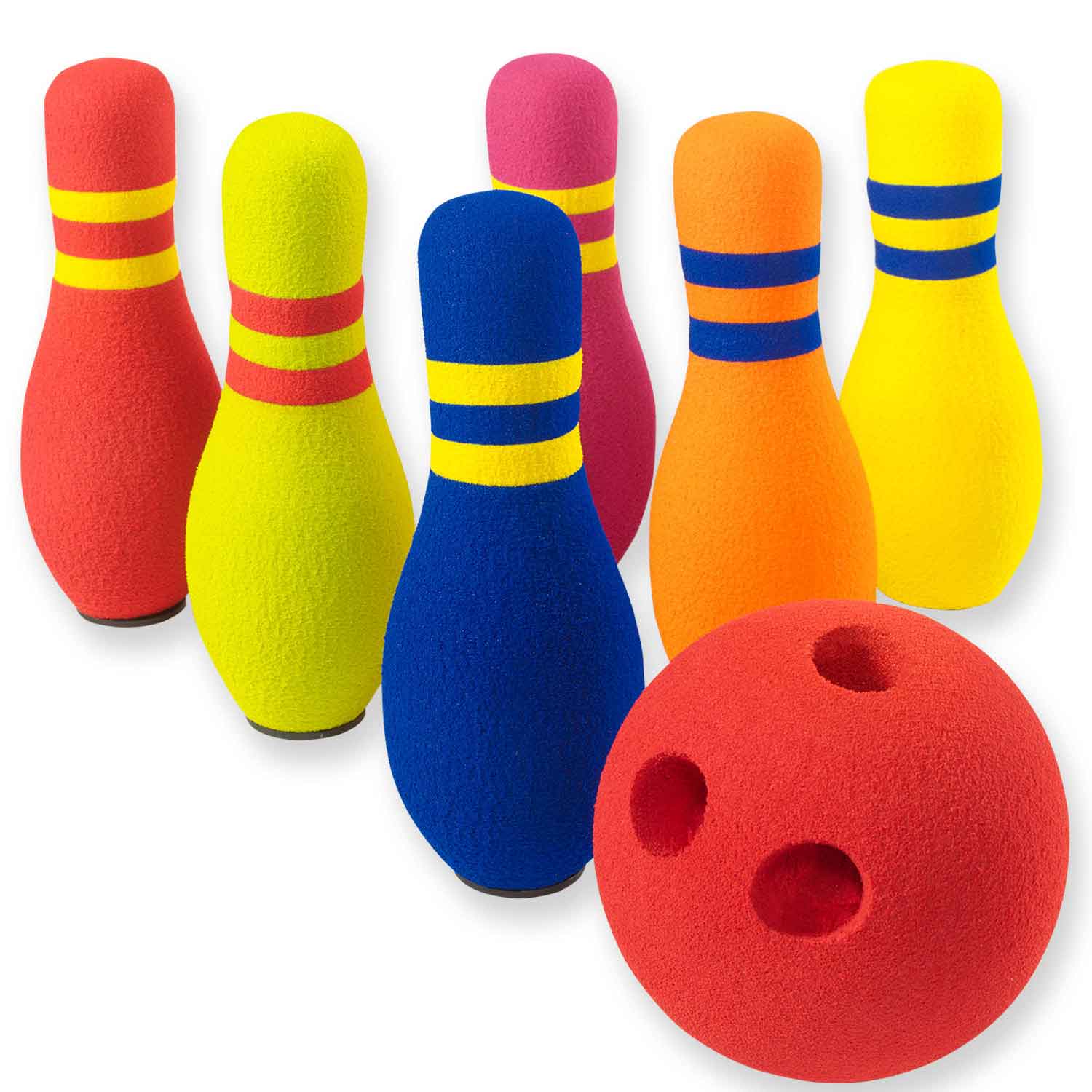 Great for indoor play or out! 6-pin bowling set includes flat bottomed pins and foam ball. Set is packed in a sturdy zippered bag for portability and storage.