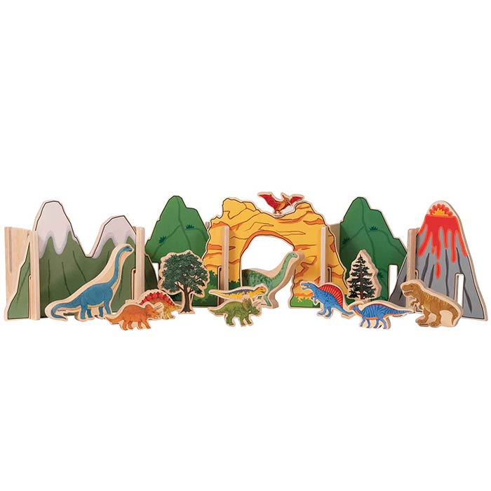 - Includes mountains, a rock formation, volcano, grass-covered hills, trees and 10 different dinosaurs
