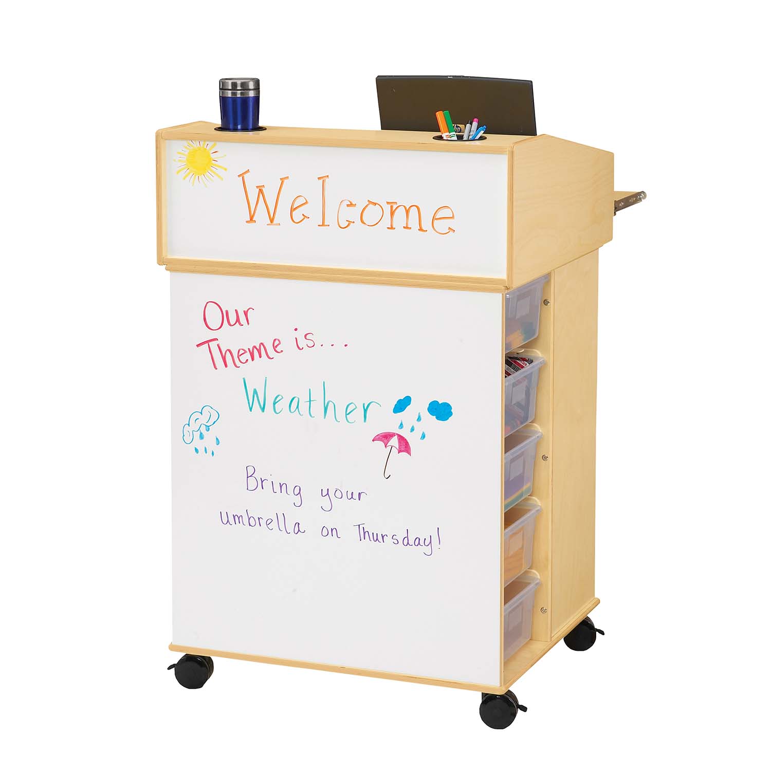 Process check-in, manage messages, mail, and homework with this Communication Center. Write-n-Wipe front is perfect for announcements or displaying projects. Pull-out drawer, 37 1/2" high, is ideal for a laptop. Two oversized cup holders, eighteen removable mail partitions, and ten clear tubs included.