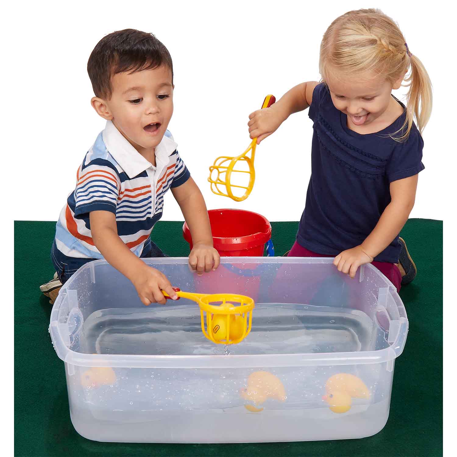 Designed for group play these 10 attractive ducks introduce children to number, shape, and color recognition through water play. The 2 unique nets encourage hand coordination and development of motor skills.