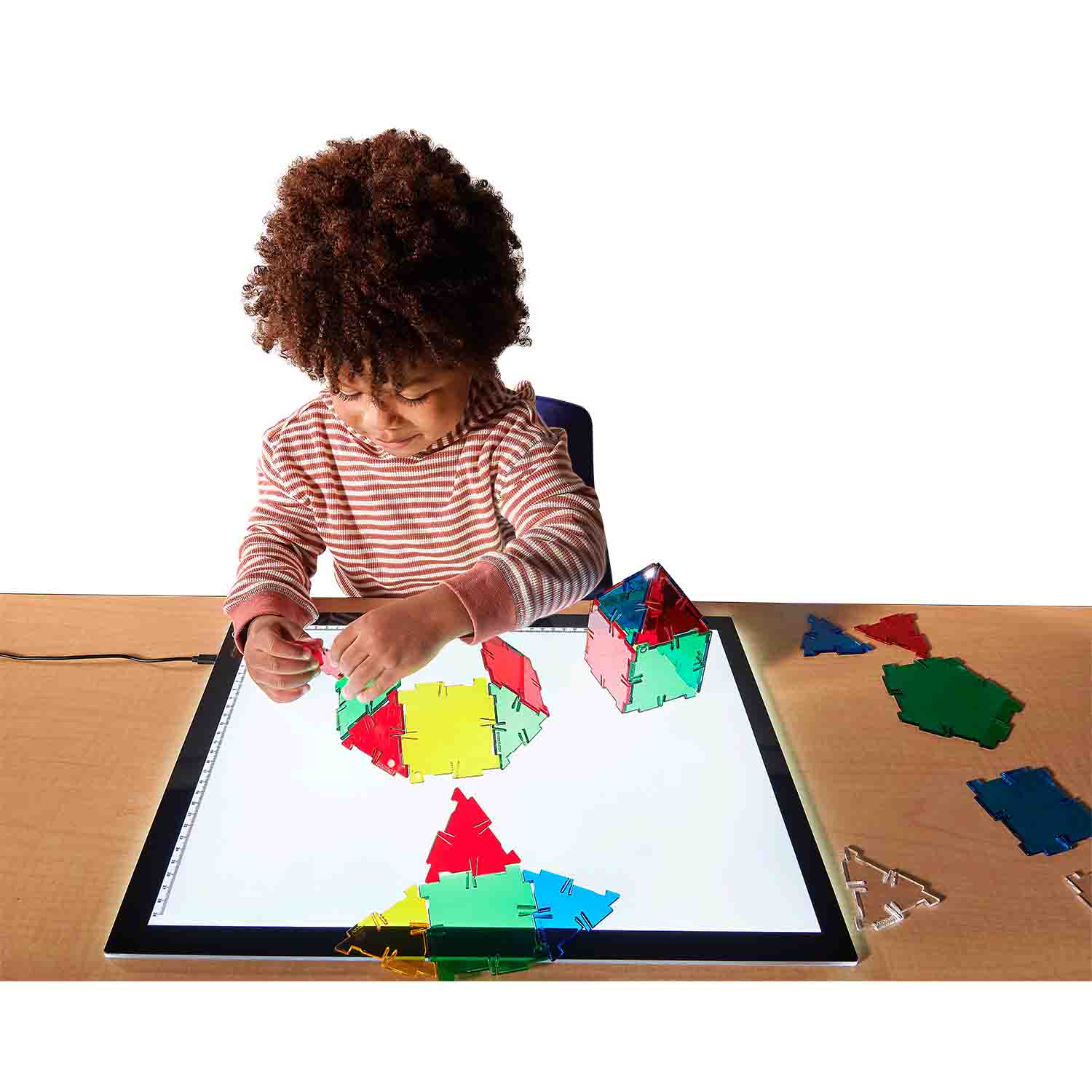 Great for budding builders, this set was designed to work on a light table or against a light source. It features red, yellow, blue, green and clear pieces in 3 key shapes (squares, equilateral triangles and pentagons) allowing children to construct their first 2D & 3D shapes with ease!