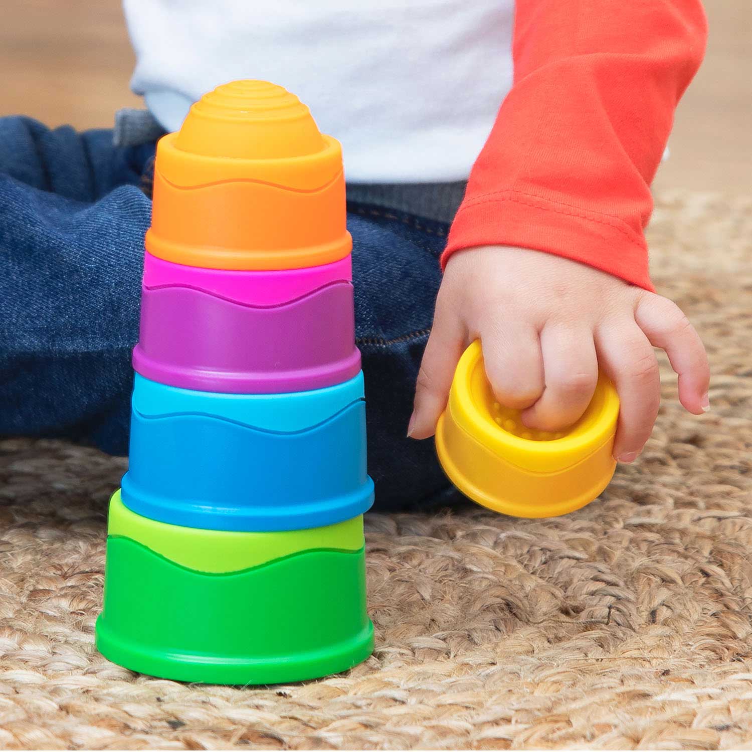 A stack-and-discover experience with squishy, silicone textured bubbles on each piece to push and pop for a fun, sensory experience. Each cup features a unique texture pattern. Little fingers will love to touch, push, and pop them again and again. Dimpl Stack encourages fine motor skills, spatial reasoning, sensory learning, tactile exploration.