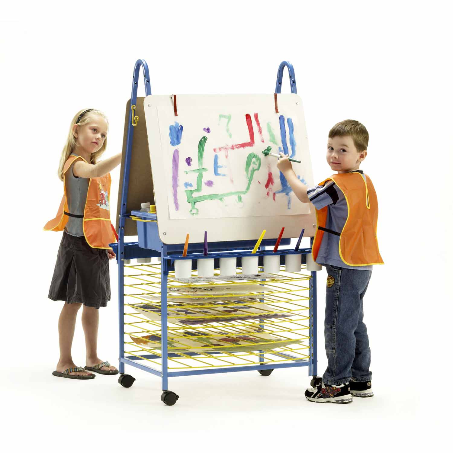 This art easel features convenient storage including an oversized tub that pulls out and large racks that can hold stacks of paper or finished works of art. Also includes two removable paint trays with 7 paint pots in each that have spill-proof caps. Features: 2 dry-erase painting surfaces (choose from 2 positions upon assembly), 10 built-in drying racks, 1 sliding Really Big Tub, 2 Apron hooks, Large art paper clips, 2 removable paint trays with 7 paint pots in each and spill-proof caps. Cleaning is a breeze with paint trays that clip on and off.
