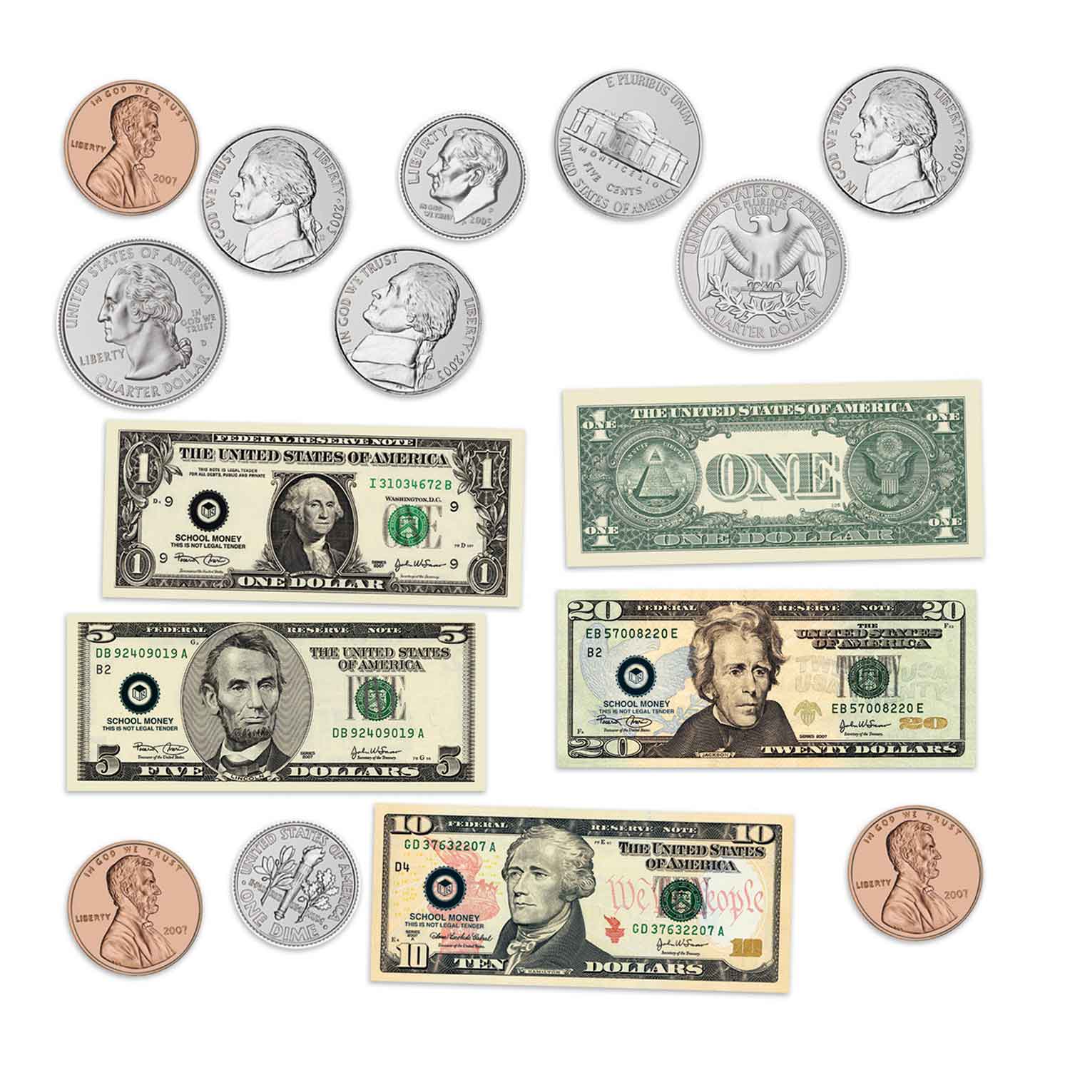 - Includes 36 coins (pennies, nickels, dimes, quarters) at 4x actual size, 9 bills (1-, 5-, 10- and 20-dollar bills) at 1.5x actual size (9½"L x 4"H) and activity guide