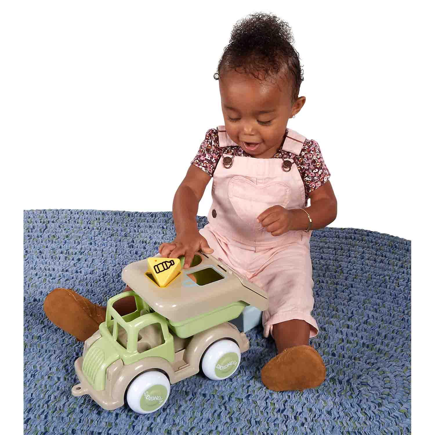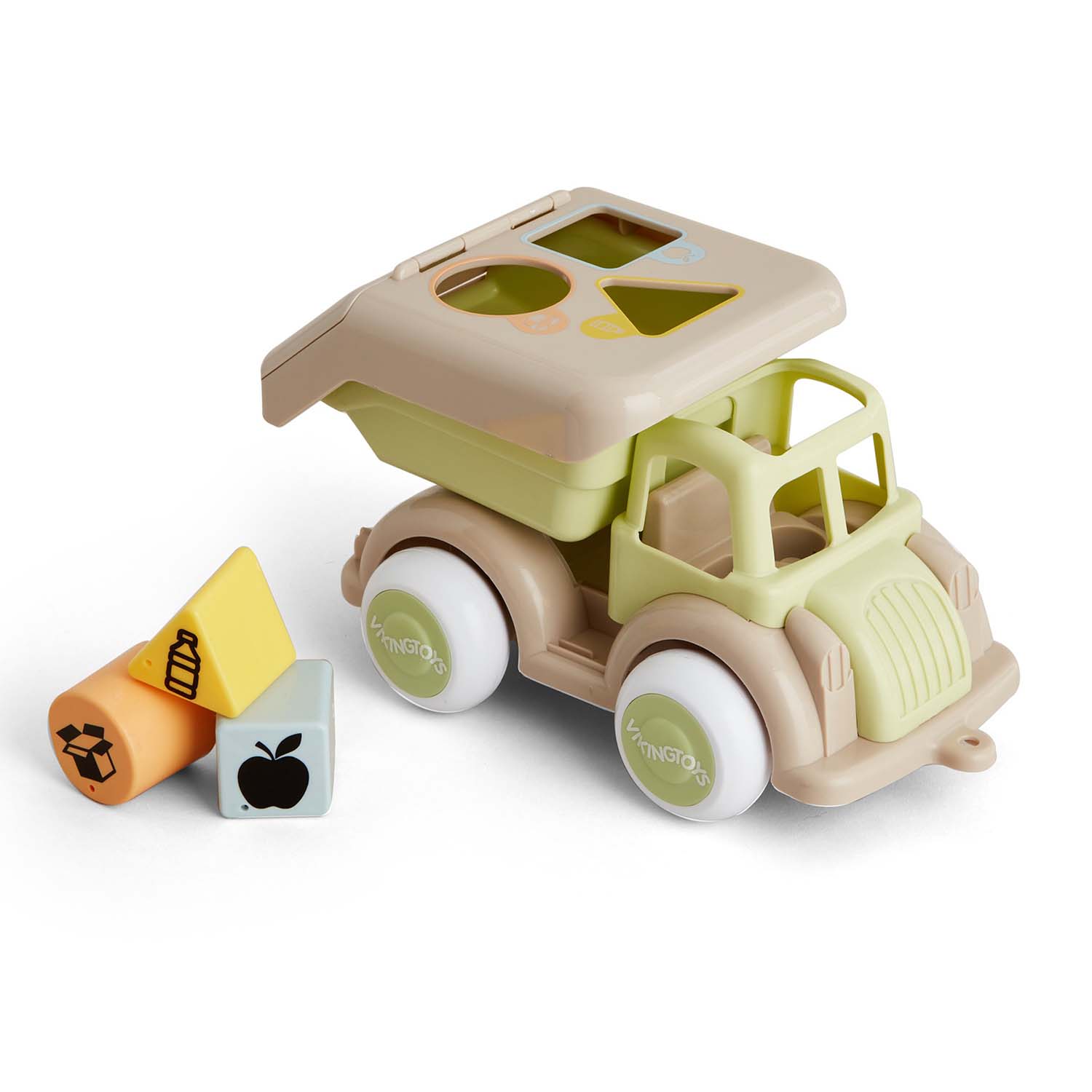 This fun and eco-friendly shape-sorting recycling truck is made from sugar cane and features a sorting box on the flatbed to help children learn about sorting bottles, leftovers and cartons.