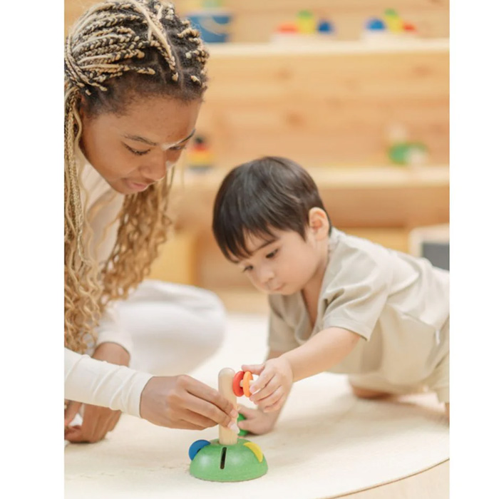 Strengthen fine motor planning, grip control, and bilateral coordination through horizontal ring stacking. Supports sequencing, spatial awareness, counting, and self-correction with purposeful, repeatable play. Features base with post and 5 rings. Made from sustainable, non-toxic materials.