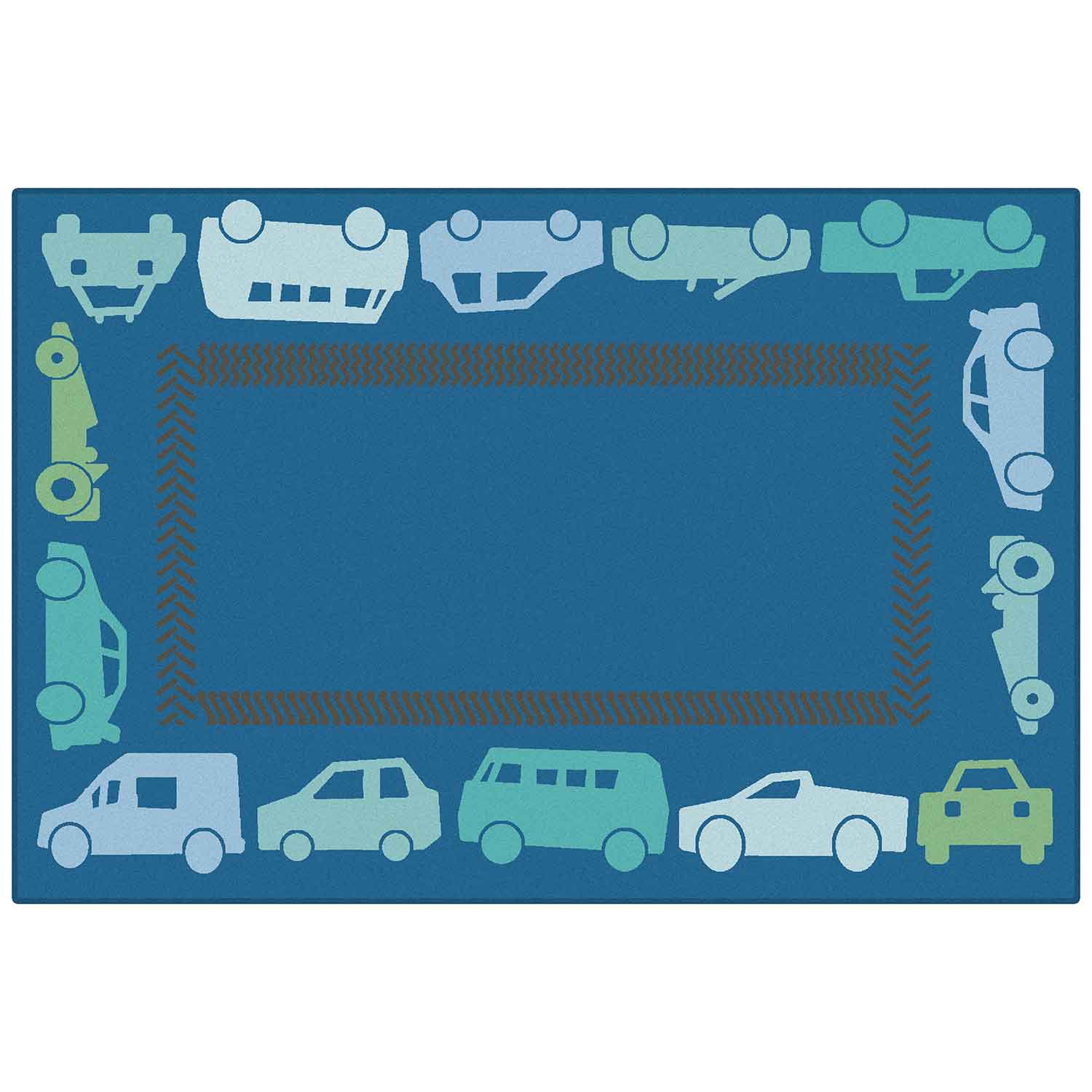Children can race and vroom! The All Autos Border Rug is perfect for any classroom's block play area. This carpet features fun vehicle images that stimulate creative, imaginative play. Rectangle 6' x 9' Blue.
