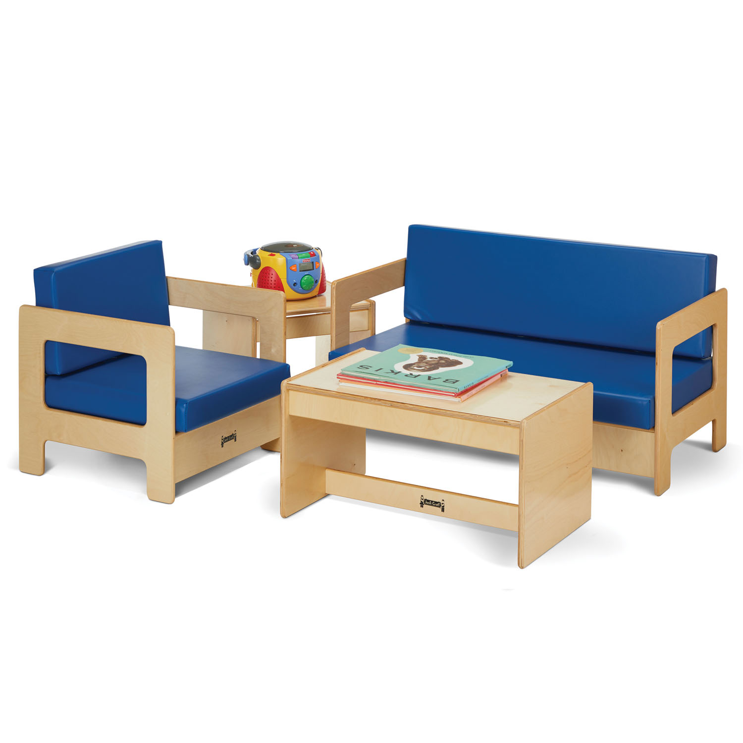 A living room set sized just for kids. Create a comfortable area for children in dramatic play areas and reading nooks. Baltic Birch framing and comfortable cushions make reading fun! Set includes couch, easy chair, coffee table, and end table. All pieces are available separately. Replacement cushions also available for the sofa and chair.
