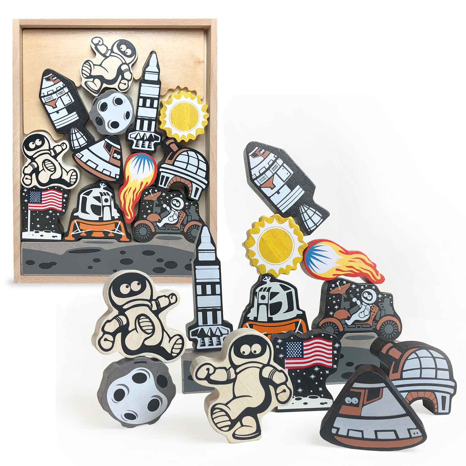 Inspired by the Apollo 11 landing on the Moon, this eco-friendly wooden playset is a perfect addition to your block play to foster creativity and problem-solving skills. Use as a stacking game to develop fine motor skills. Wooden storage box is included for easy cleanup.