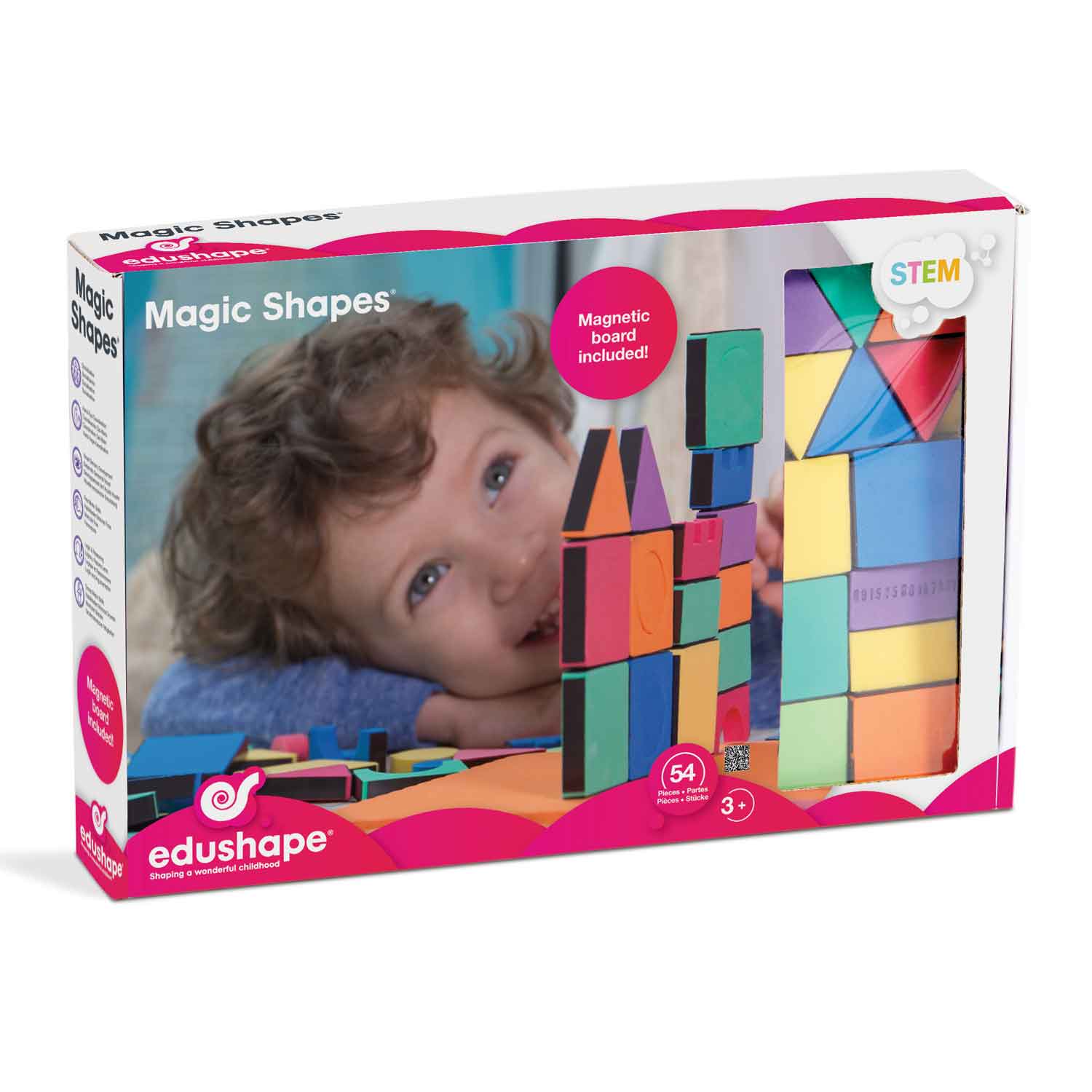 Unique 3 dimensional magnetic construction blocks incorporating colorful shapes for endless creations.