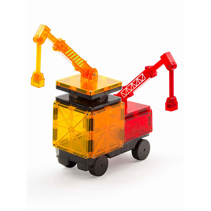 The MAGNA-TILES® Builder set takes imaginative play and STEAM learning to new heights! Extend and swivel the magnetic crane to move bricks around the children's creations. Click together roads for magnetic construction vehicles or favorite cars. Durable enough to use in the classroom, this set is compatible with other MAGNA-TILES® construction sets so children can expand their world with the shapes already in their collection.