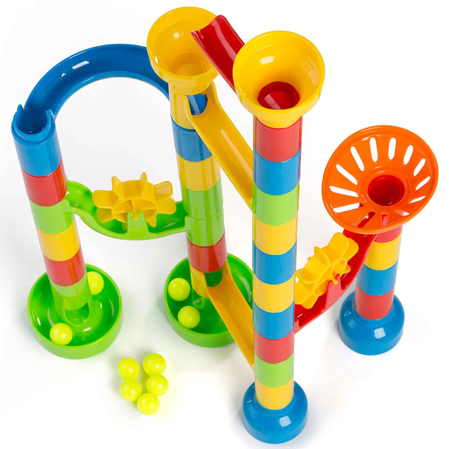 There's never just one way to marvel at marbles as they run down different paths! This activity builds problem solving and eye-hand coordination skills. Try multiple combinations to make the marbles slide down the different tubes, rails, roulette circuit and small modules with scoops which divert the ball from its path.