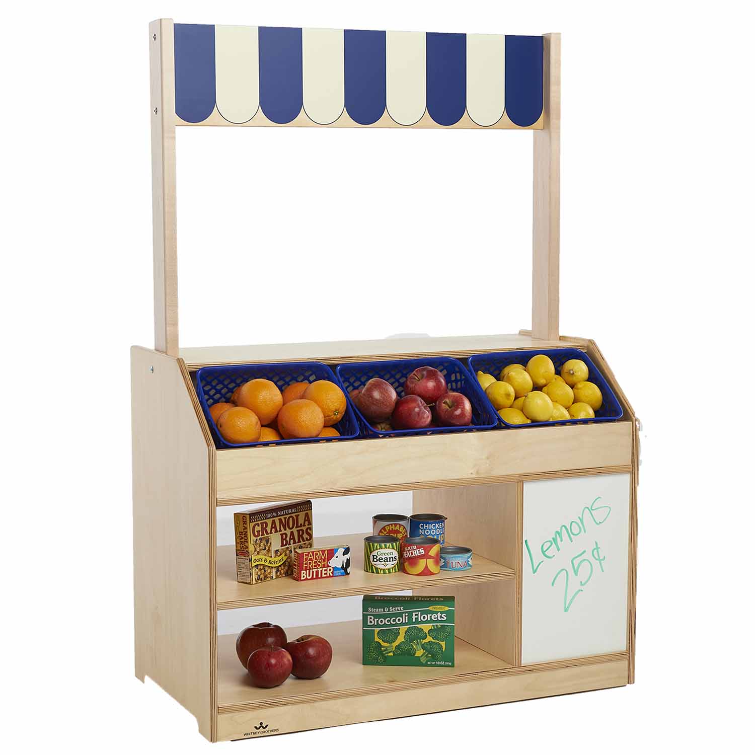 This cute market stand features a colorful awning and lots of space to store and display items. The top shelf holds three plastic bins to feature your fresh produce! Be sure to let customers know about daily specials on the dry-erase board. There is also additional storage in the back of the unit.