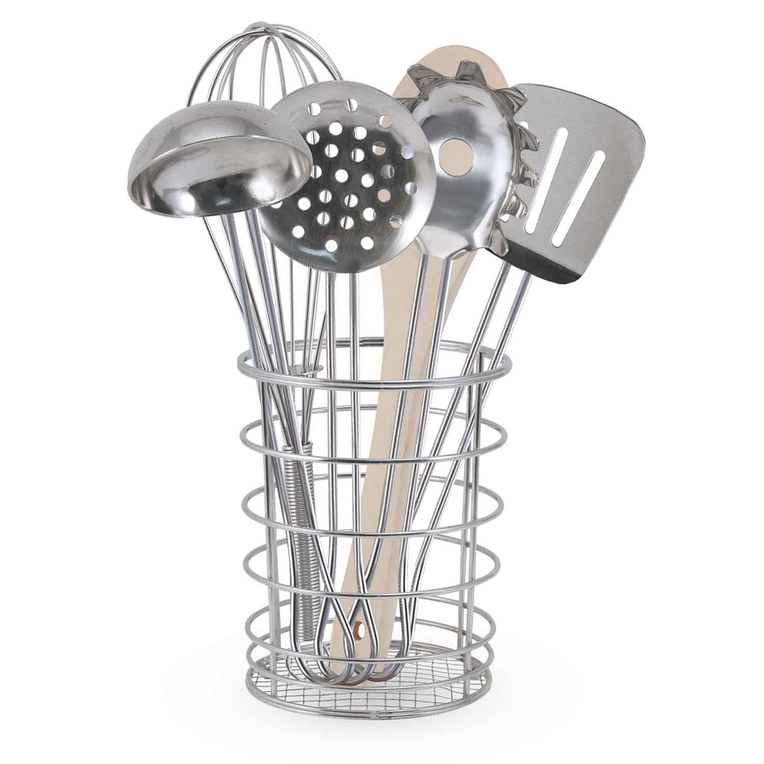 - 7-piece cooking utensils set includes a whisk, ladle, spatula, slotted spoon, spaghetti server, wooden spoon and holder