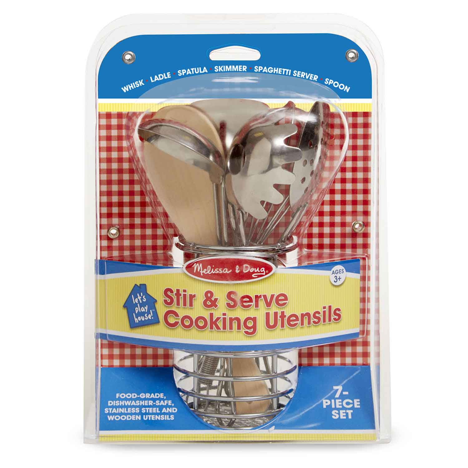 Six durable, stainless steel toy utensils (whisk, ladle, spatula, skimmer, spaghetti server, and spoon) in a metal holder, offer realistic kitchen play for today's young chefs.
