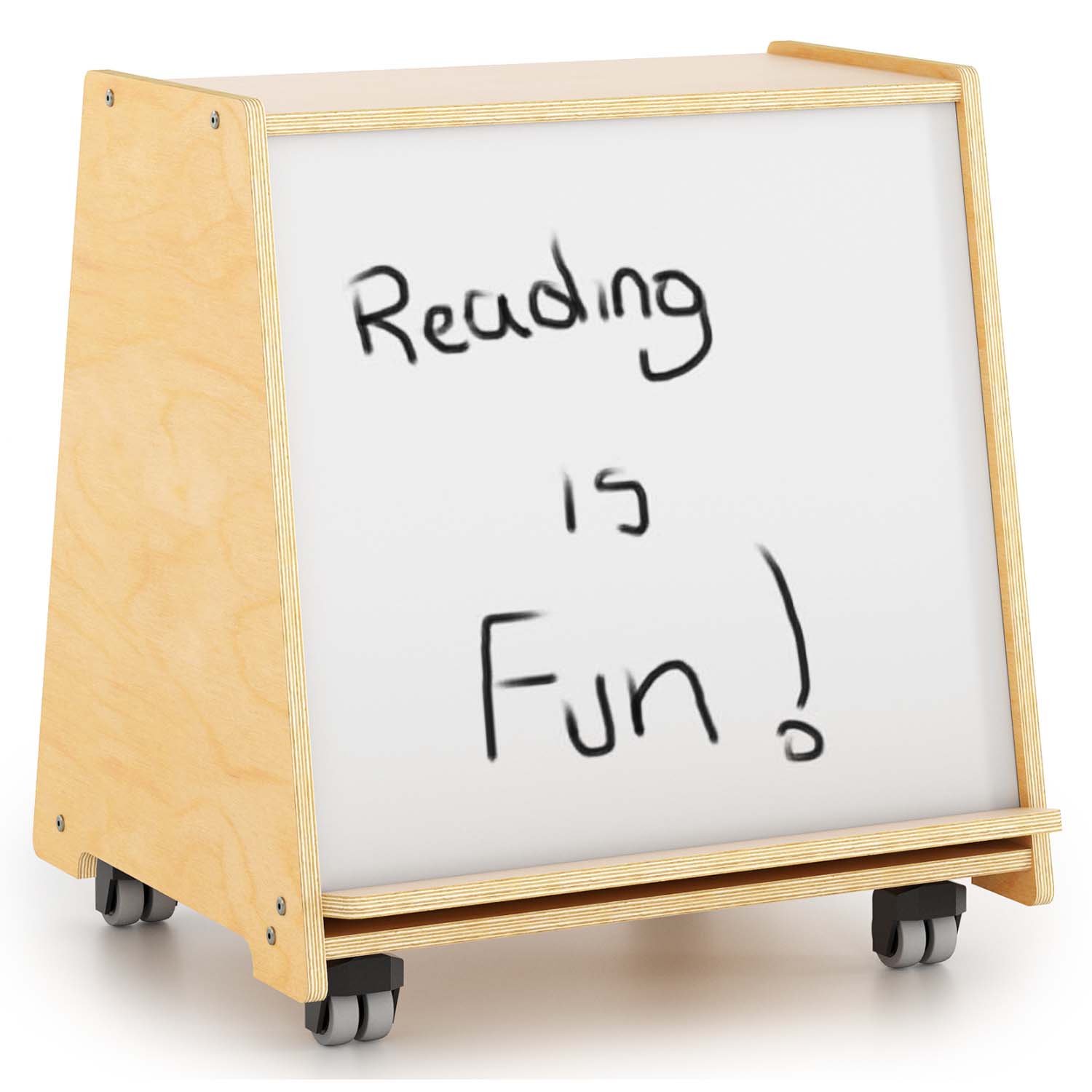 Perfect for storytime! This cabinet features a non-ghosting marker board with an angled cleat to hold markers and an eraser or to display books at just the right level for small children to read along. In back, the six removable dividers provide organized storage for really big books.