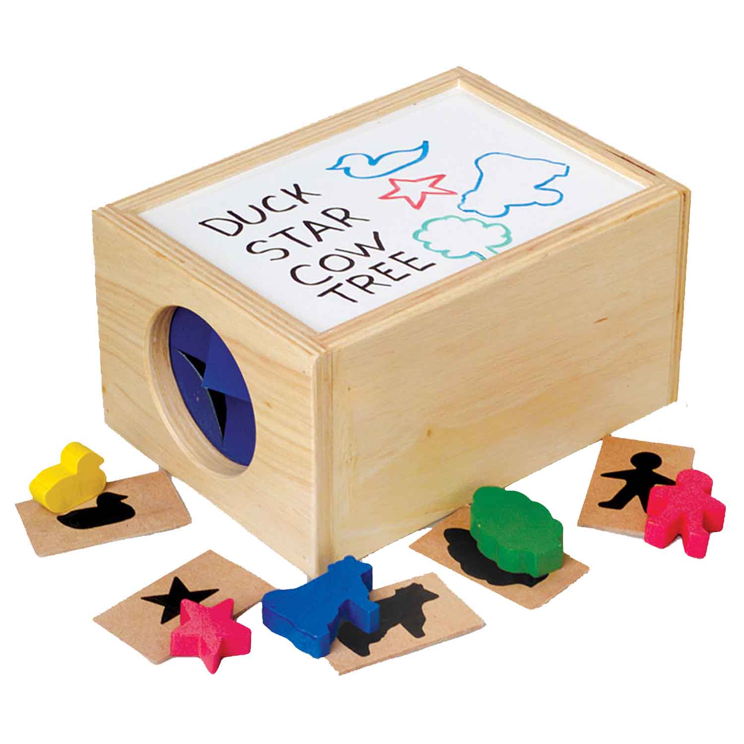 Children will use visual and tactile skills to feel and find these matching shapes. Includes 22 colorful wooden shapes with 22 matching tiles and drawstring bag. The wooden box features write-on/wipe-off board on top, solid wood bottom.