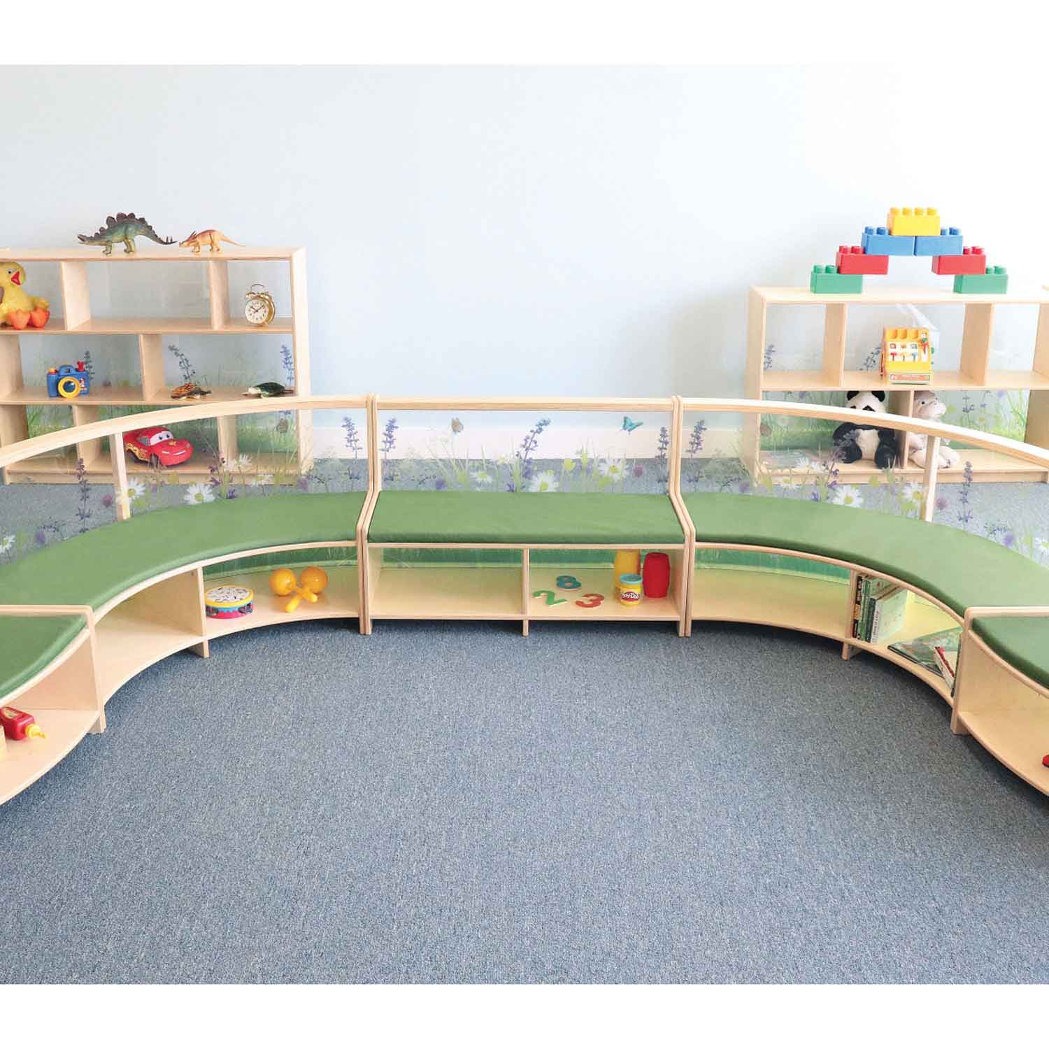 Create a flexible nature-inspired reading area! The sofa features an open compartment for book storage beneath the seat and an innovative back panel constructed in safe, shatterproof clear acrylic imprinted with an inviting nature scene that integrates with all other pieces in our exclusive Nature View collection. Combine with other Nature View Straight or Curved Sofas (each sold separately) to form a horseshoe, circle, S-shape or other inviting and flexible learning area that children will love! All corners and edges are rounded over and finished smooth for safety. A perfect solution for flexible classroom seating!