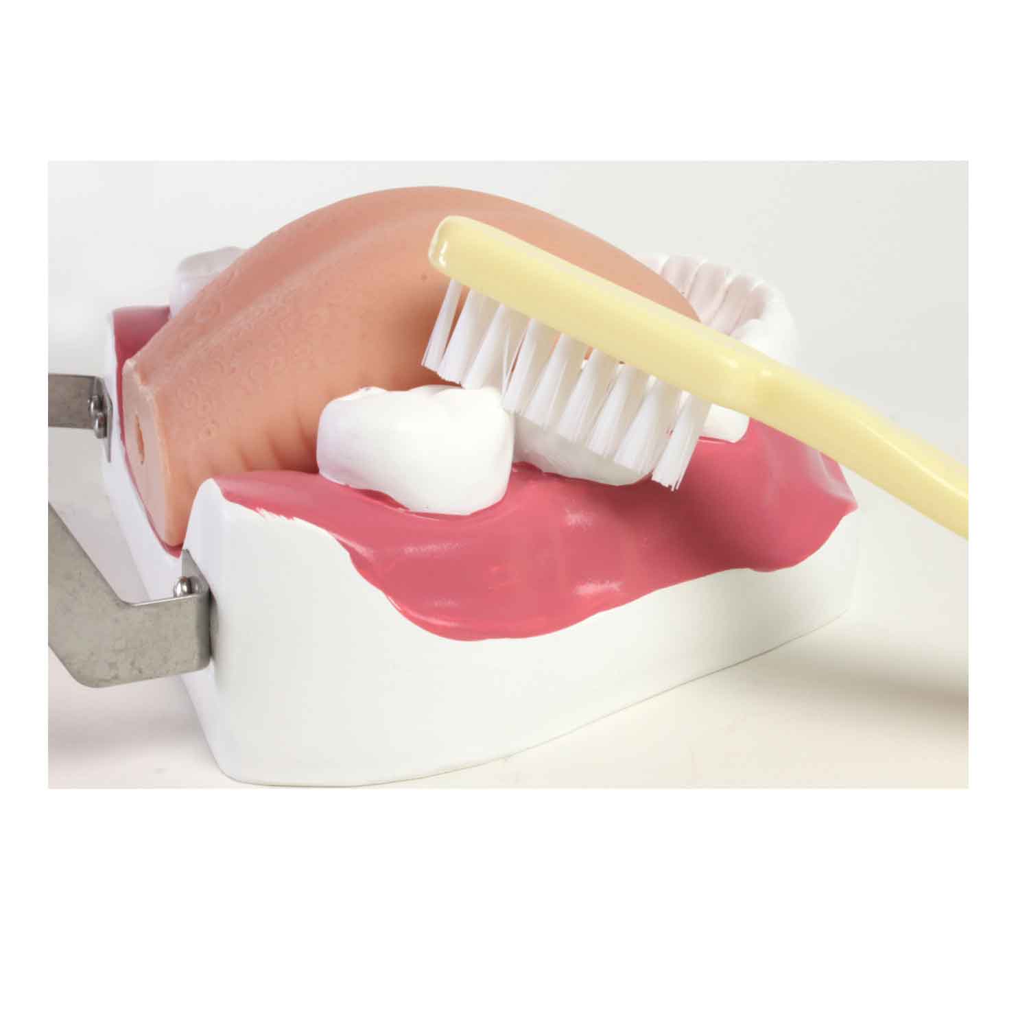 Demonstrate proper technique for brushing teeth and gums using this model. Hinged upper and lower palates simulate the normal opening and closing of the mouth.