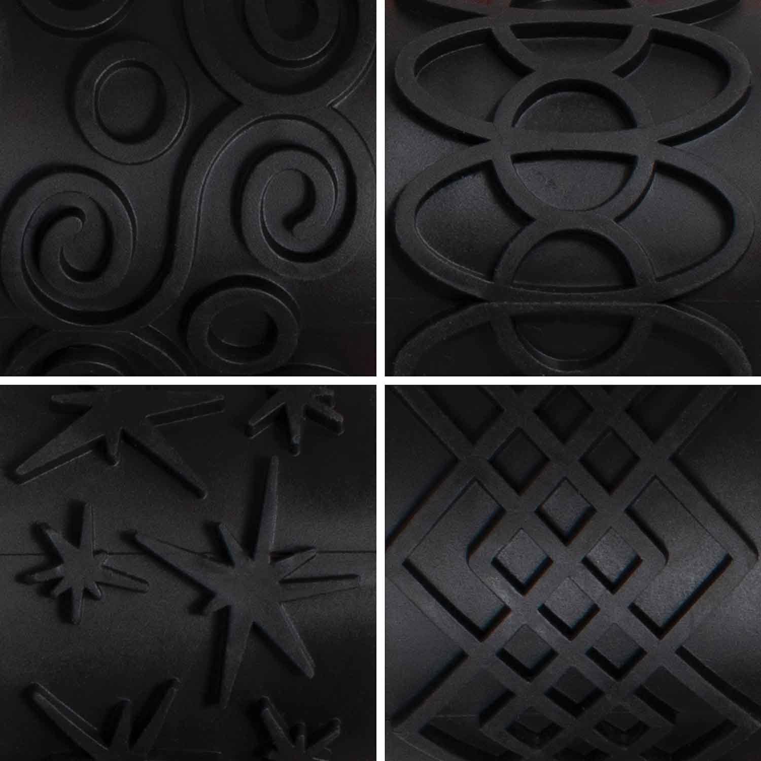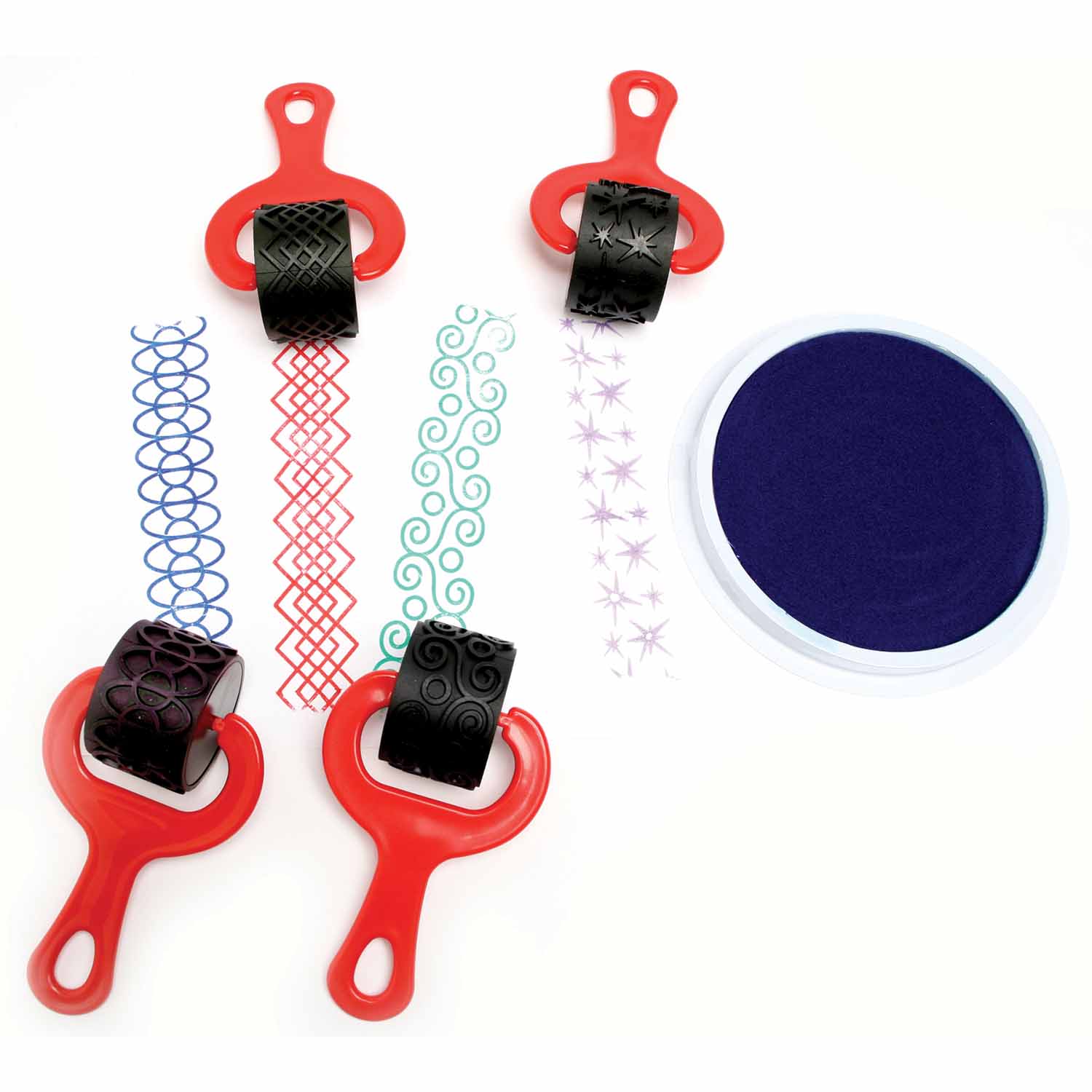 Here's a superset of four heavy duty rollers with 1½" wide unique, inventive, and clever designs for use with paint or clay. Each 5" durable plastic, comfort-grip handle features a unique design molded in hard rubber on a sturdy roller. Rollers are easily cleaned allowing for child-safe, long term use.