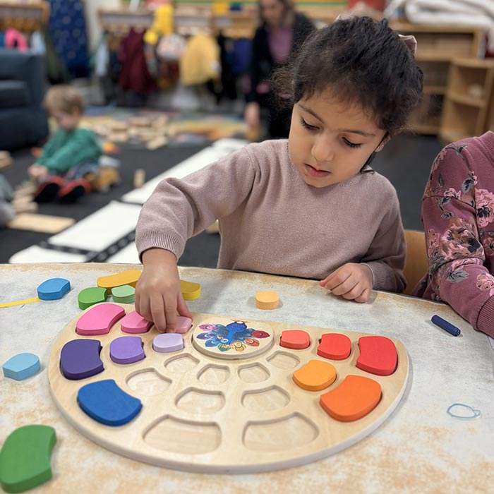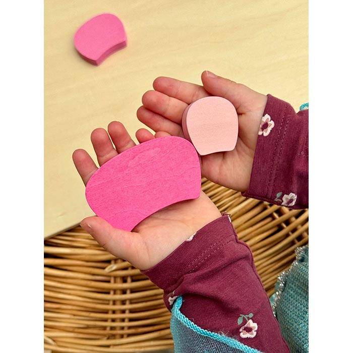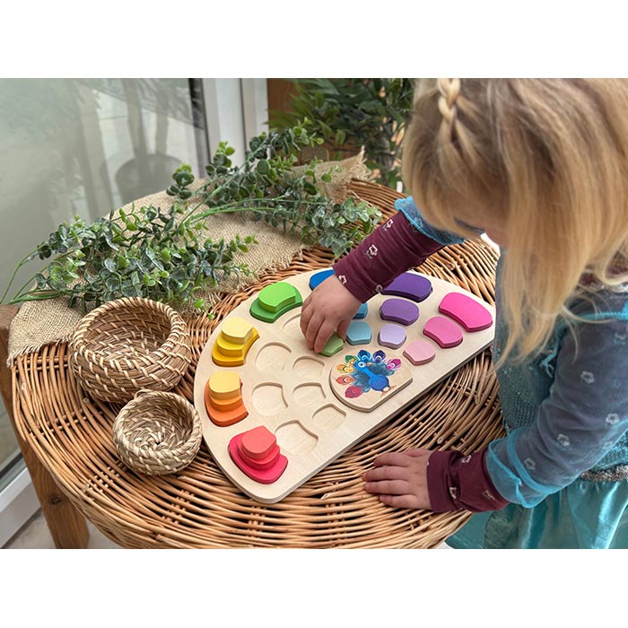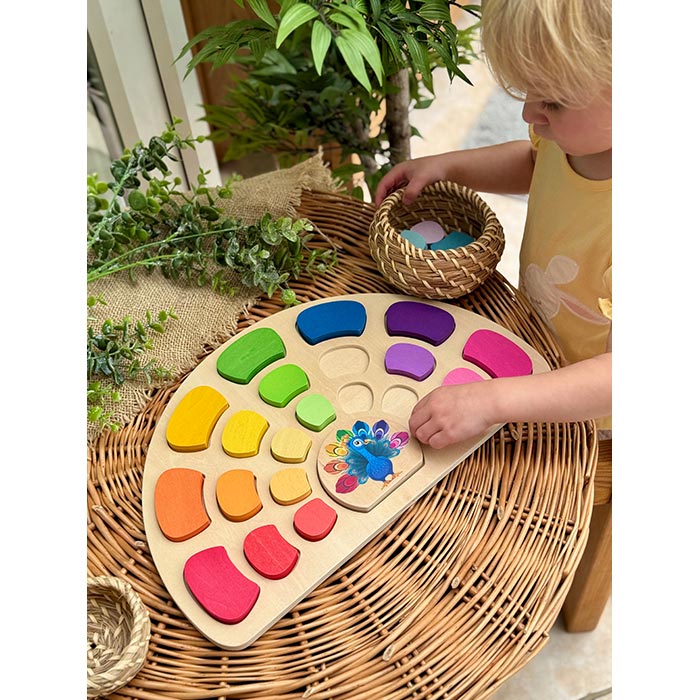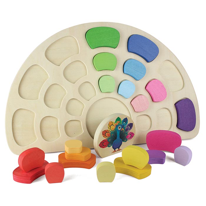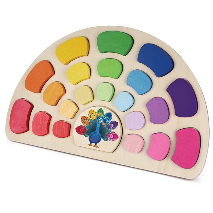 Pattern and Play Peacock builds color recognition, sorting, counting, and spatial reasoning through 22 chunky inset feather pieces in varied sizes and shades. Tactile wooden pieces double as loose parts for extended exploration. Supports fine motor development and early math concepts in early learning environments.