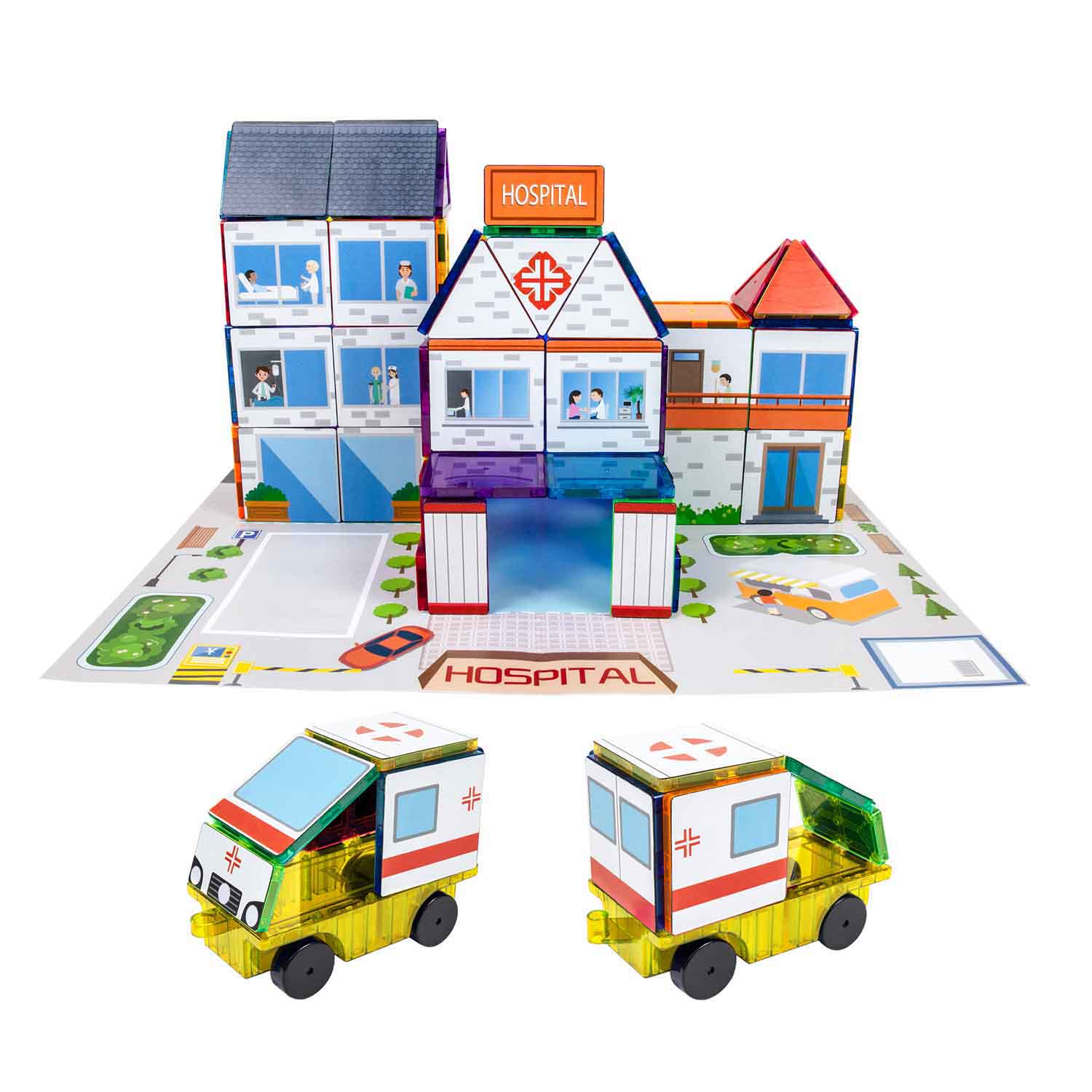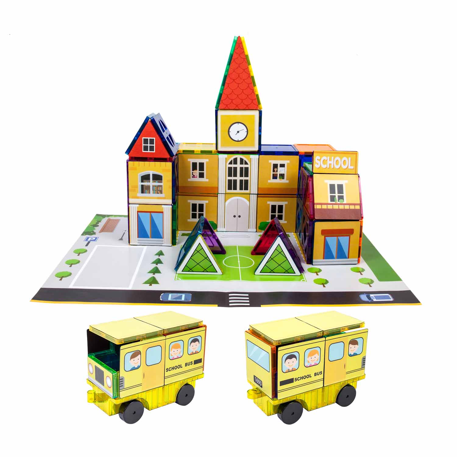 Here’s a new twist to magnetic building! Explore themes, build vocabulary and be STEM-engaged as you add printed design tiles to your buildings. Build 3 distinct sets as shown or make your own creations.
