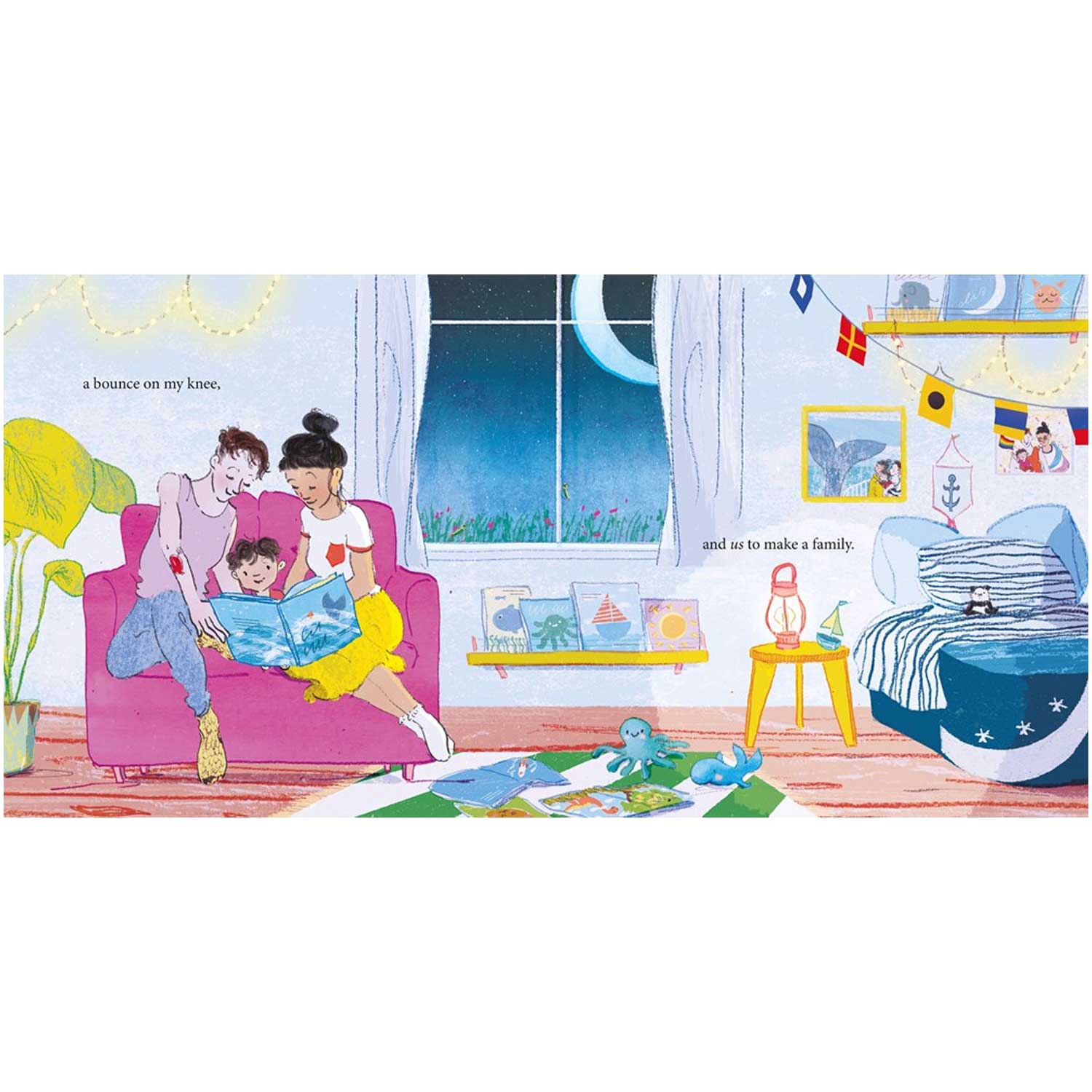Two mommies spend a sunny day with their toddler in this cozy, rhyming picture book that is a loving celebration of family. This cheerful book follows a family from morning to night in lively rhyme that rolls off the tongue. There's a buzz for each bug, and a breeze for each tree, and plenty of hugs for you and me. The toddler and mommies take a morning bike ride to a farm stand, they visit a zoo in the afternoon, and in the evening there's the bath and storybook routine before the child is tucked cozily into bed. There are seas for ships and kisses for lips, so we can whisper I love you!