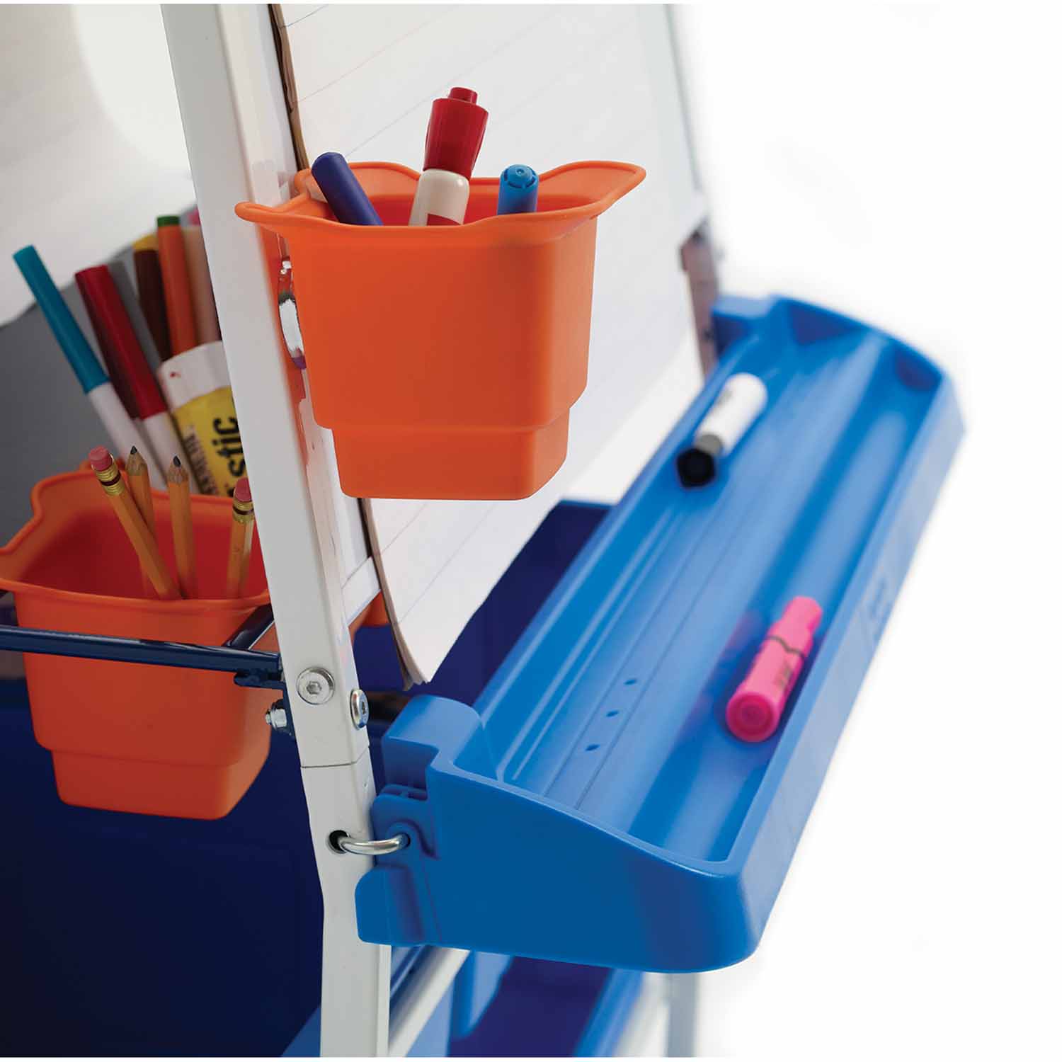 This easel features the ultimate in storage! This versatile teaching easel provides an organized lesson center in one compact footprint along with mobility throughout the classroom. With a magnetic dry erase board, Ultra-Safe premium book ledge, lots of tub and chart paper storage as well as new book folders to keep the middle shelf free for other teaching materials, it is designed to be the command center of the classroom. With its spacious storage and multiple compartments, this Premium Reading and Writing Center can accommodate classroom books and writing tools in one place, making it convenient for children to access everything they need without any hassle. The large dry erase board and the two magnetic boards provide ample space for writing and drawing, allowing children to showcase their creativity and imagination. The adjustable book ledges and the 3-inch casters make it easy for children to browse through books and move the center around the classroom. But that's not all! This reading and writing center comes with storage tubs, perfect for storing manipulatives, markers, crayons, and other small items. The tubs can be easily removed for cleaning and is made of durable plastic, ensuring long-lasting use. Not only does the Premium Reading and Writing Center help with organization and creativity, but it also encourages literacy skills by providing a comfortable and inviting space for children to read and write. The reading writing center is also made of sturdy birch plywood, ensuring its durability and longevity. Investing in the Premium Reading and Writing Center is investing in your student's future. This center provides a comfortable and organized space for children to develop their reading and writing skills and cultivate their creativity. So what are you waiting for? Make learning fun and exciting for your students today with the Premium Reading and Writing Center.