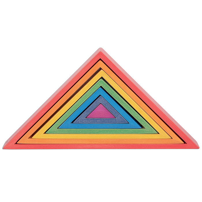 Rainbow Nesting Triangles let children explore color, shape, and balance. Made of natural beechwood, this geometric set includes 7 nesting triangles in the colors of the rainbow. Each triangle features an inner solid 3D shape, allowing children to develop their fine motor skills while engaging in open-ended play.