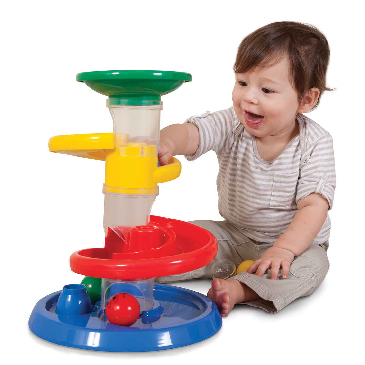 This tracking toy is ideal for developing fine motor skills, cause and effect and eye-hand coordination. The balls move slowly enough for children to follow them visually.