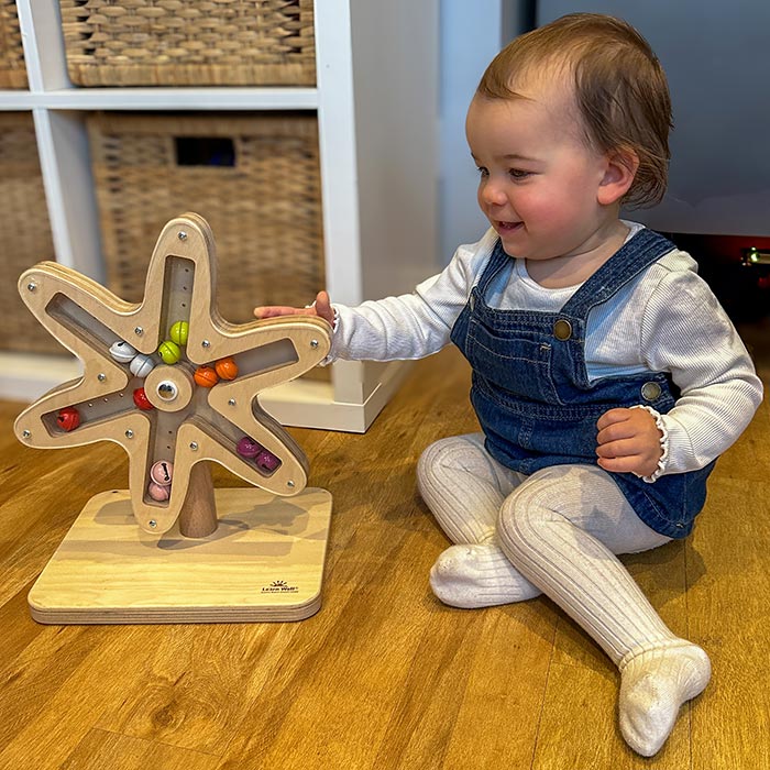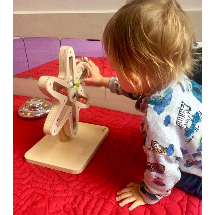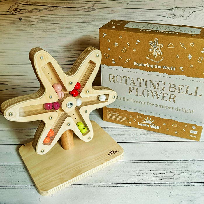 Rotating Bell Flower supports visual tracking and auditory exploration through spinning movement and enclosed chimes. Crafted from sustainably sourced wood, this 12 inch freestanding sensory resource produces varied tones based on speed. Safe from birth and ideal for inclusive early learning environments and additional support settings.