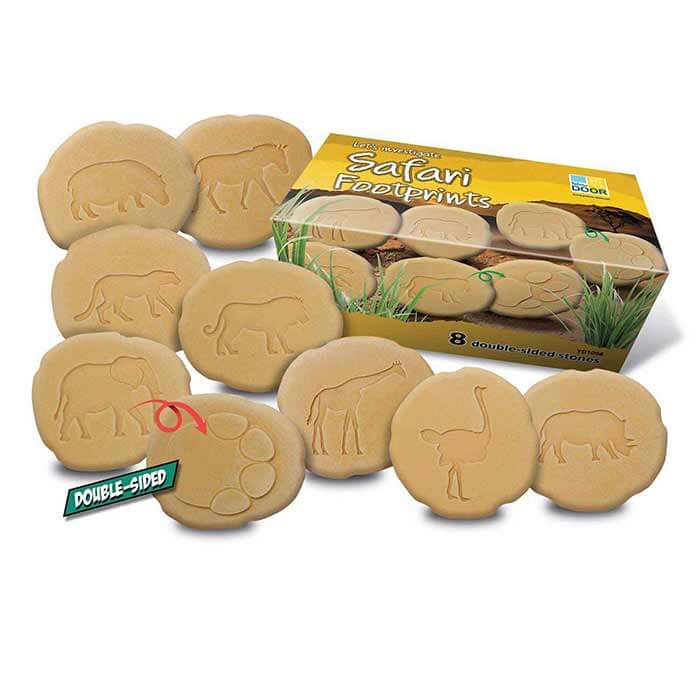 Take a walk on the wild side and explore what animals you might find on the African savanna as you follow their tracks. Each stone has a raised footprint on one side and the related creature in relief on the other. Watch out for the following animals: lion, elephant, rhinoceros, giraffe, hippopotamus, ostrich, cheetah and zebra. The footprint stones can be used in sand, water and soil, and are easily washed clean for a new adventure.