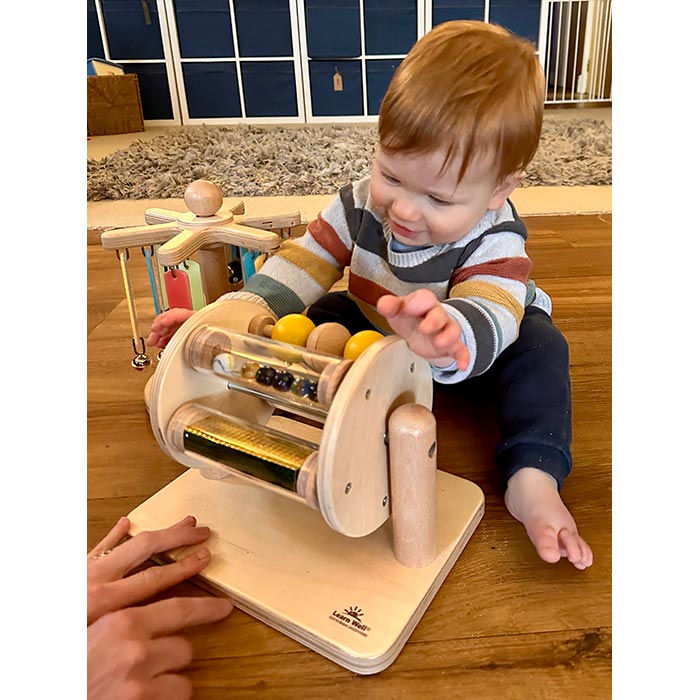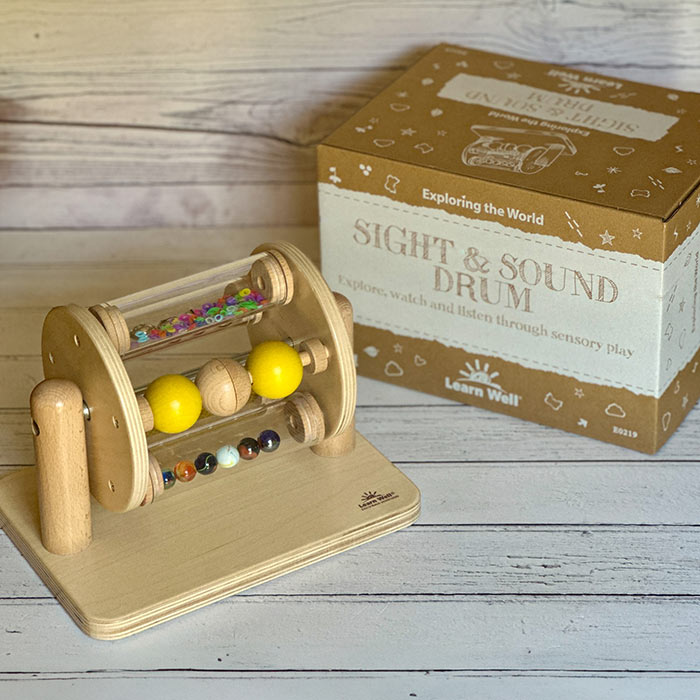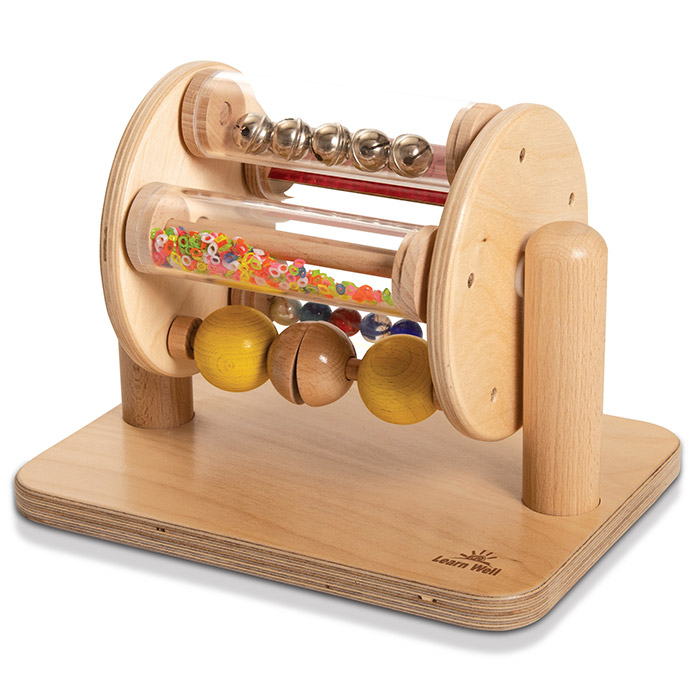 The Sight and Sound Drum supports sensory exploration through spinning motion, varied textures, and engaging sound. Four tubes filled with visually stimulating materials and clacking wooden spheres help develop motor skills, observation, and listening abilities. The spinning motion encourages interaction, supporting early learning and development. Crafted from sustainably sourced wood and safe for early learning environments.