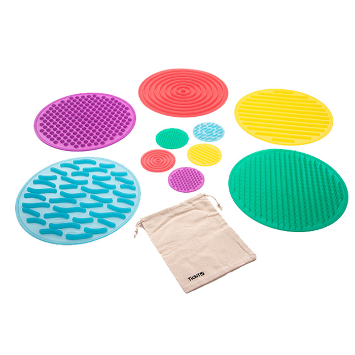 Spark curiosity and tactile exploration with the SiliShapes Sensory Circles. Made from ultra-soft, flexible silicone, this set of 10 textured circular disks offers a unique sensory experience for children. Each circle features a different pattern, inviting children to touch and compare textures. Use the "mystery bag" to challenge their senses or have them walk over the large circles to test their tactile skills. The SiliShapes Sensory Circles are perfect for enhancing sensory awareness and fine-tuning the sense of touch in a fun and interactive way.