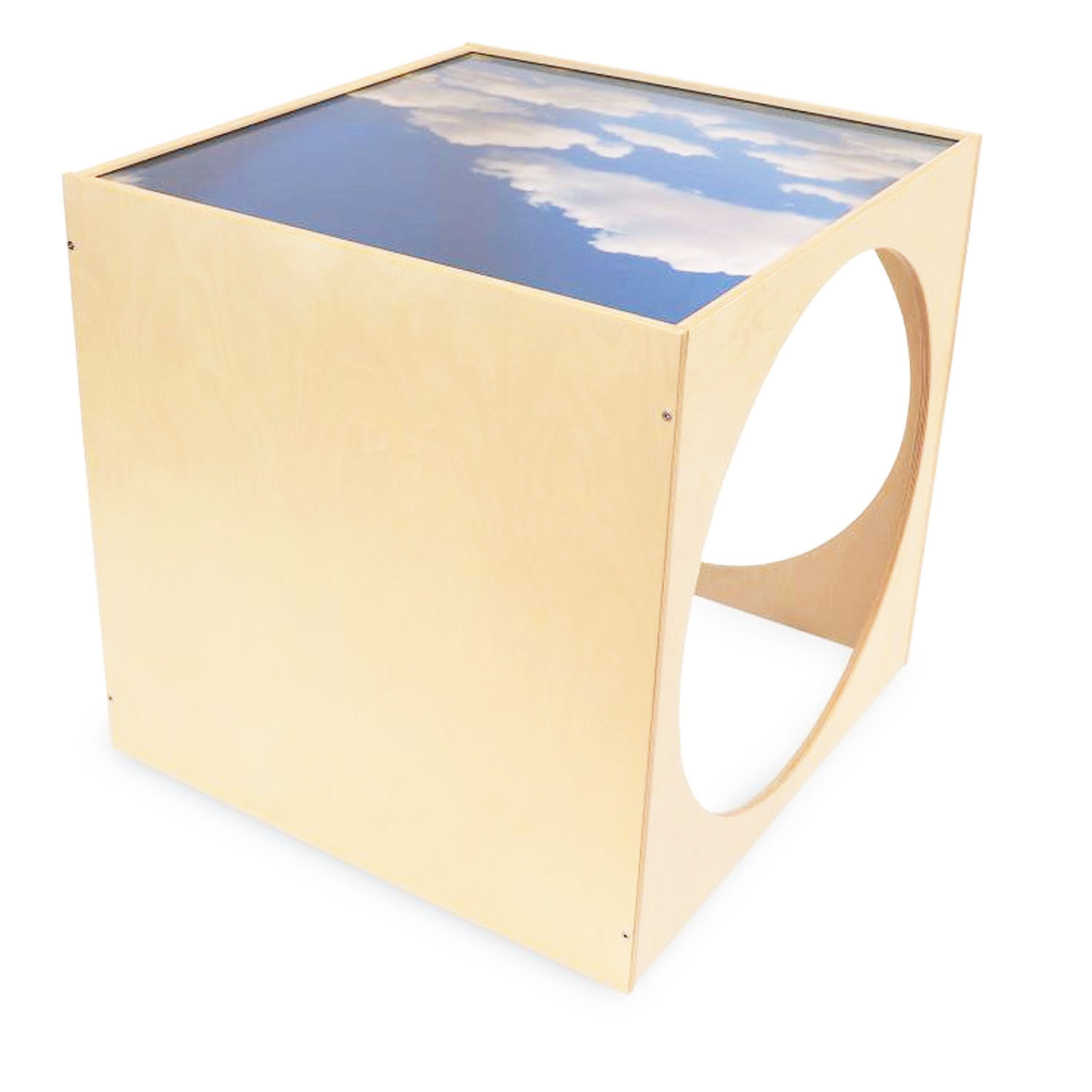 The top of this privacy cube has a shatterproof clear acrylic panel imprinted with a serene sky that invites children inside for a peaceful break while also providing easy visibility for supervision.