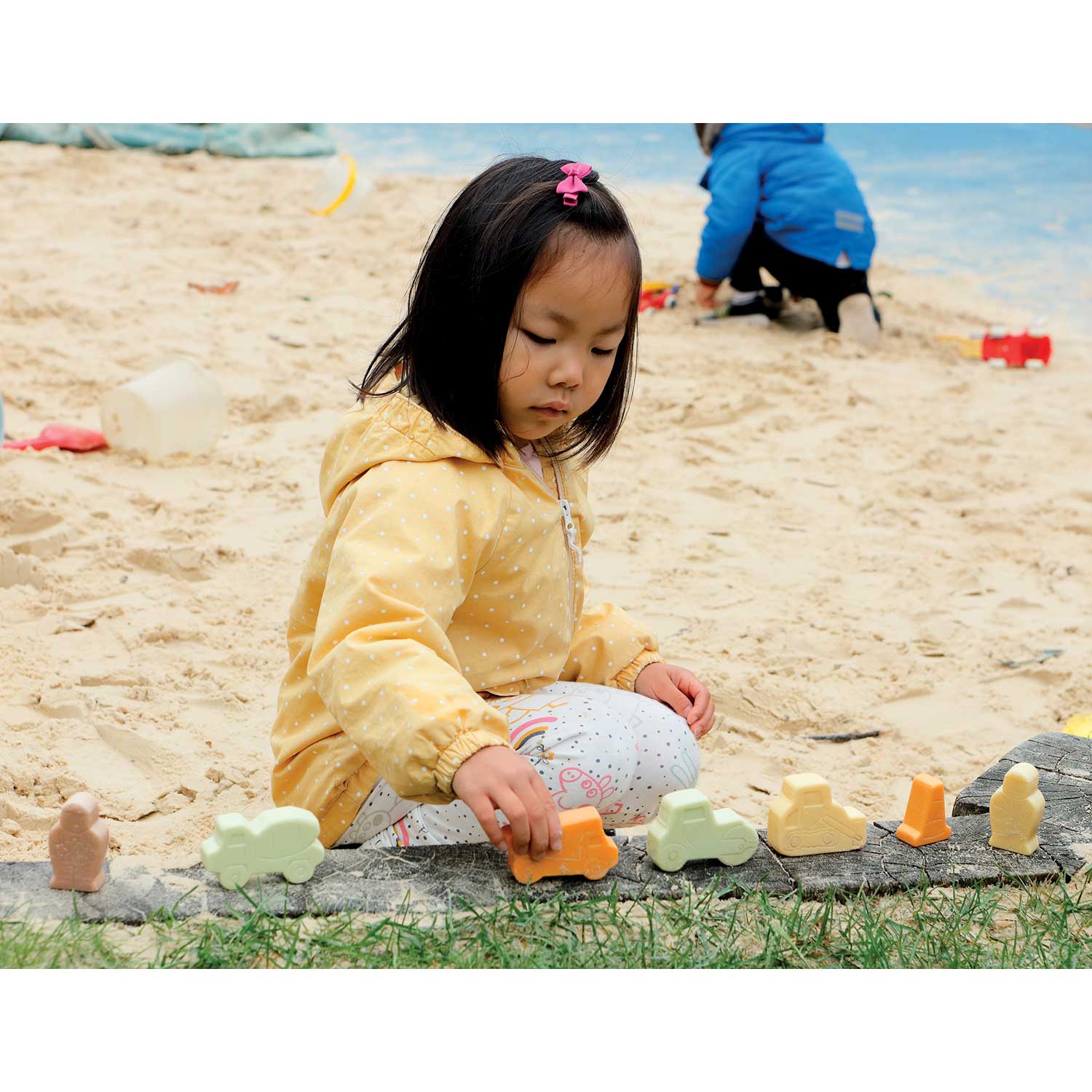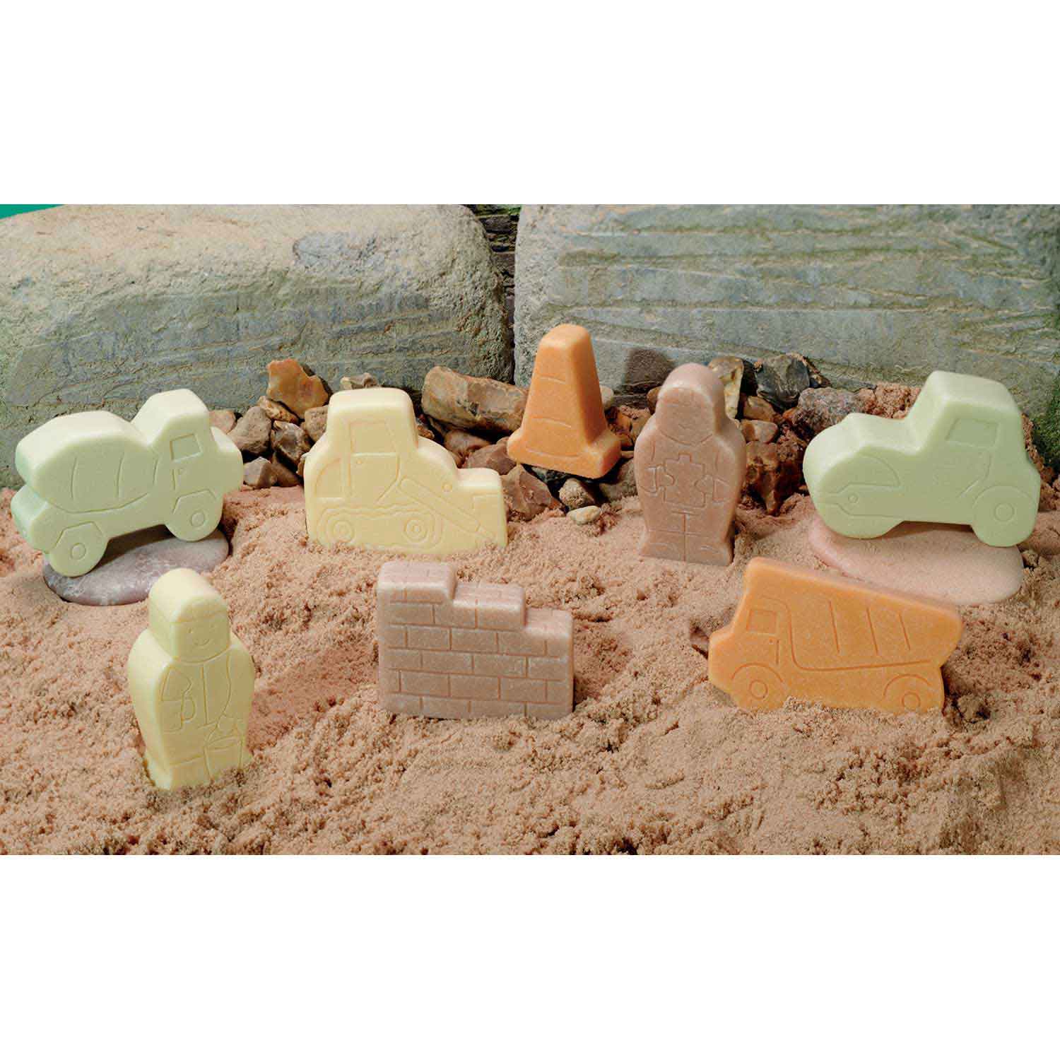 Construction play is a popular element of small world and imaginative play in early childhood. The Small World Construction is a tactile set that will inspire many adventures and creative storytelling. Created using a durable stone mix, they are tough enough to be used outdoors in sand, mud, or water. The set includes a bulldozer, concrete mixer, dumper truck, road roller, female worker, male worker, partially-built brick wall, and cone.
