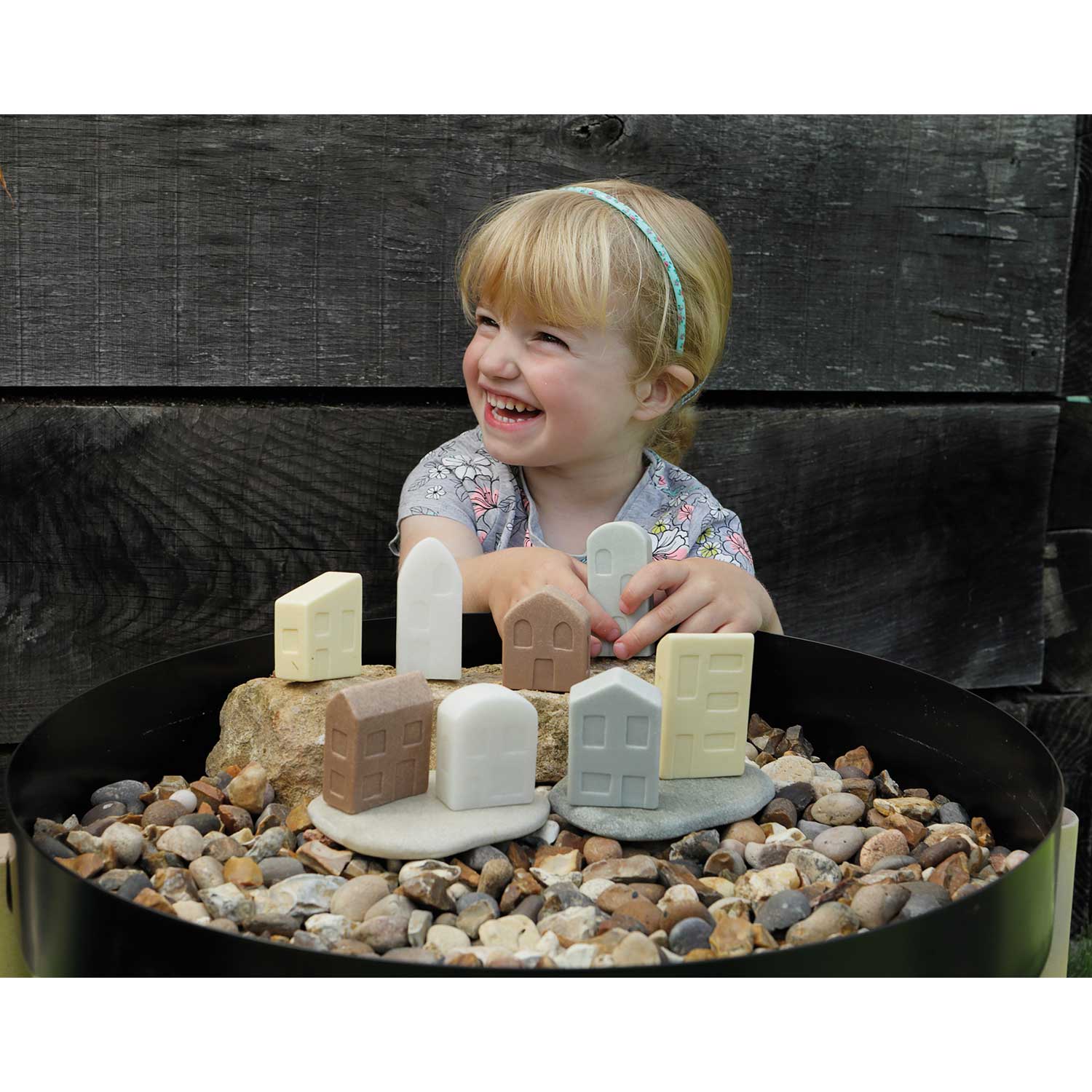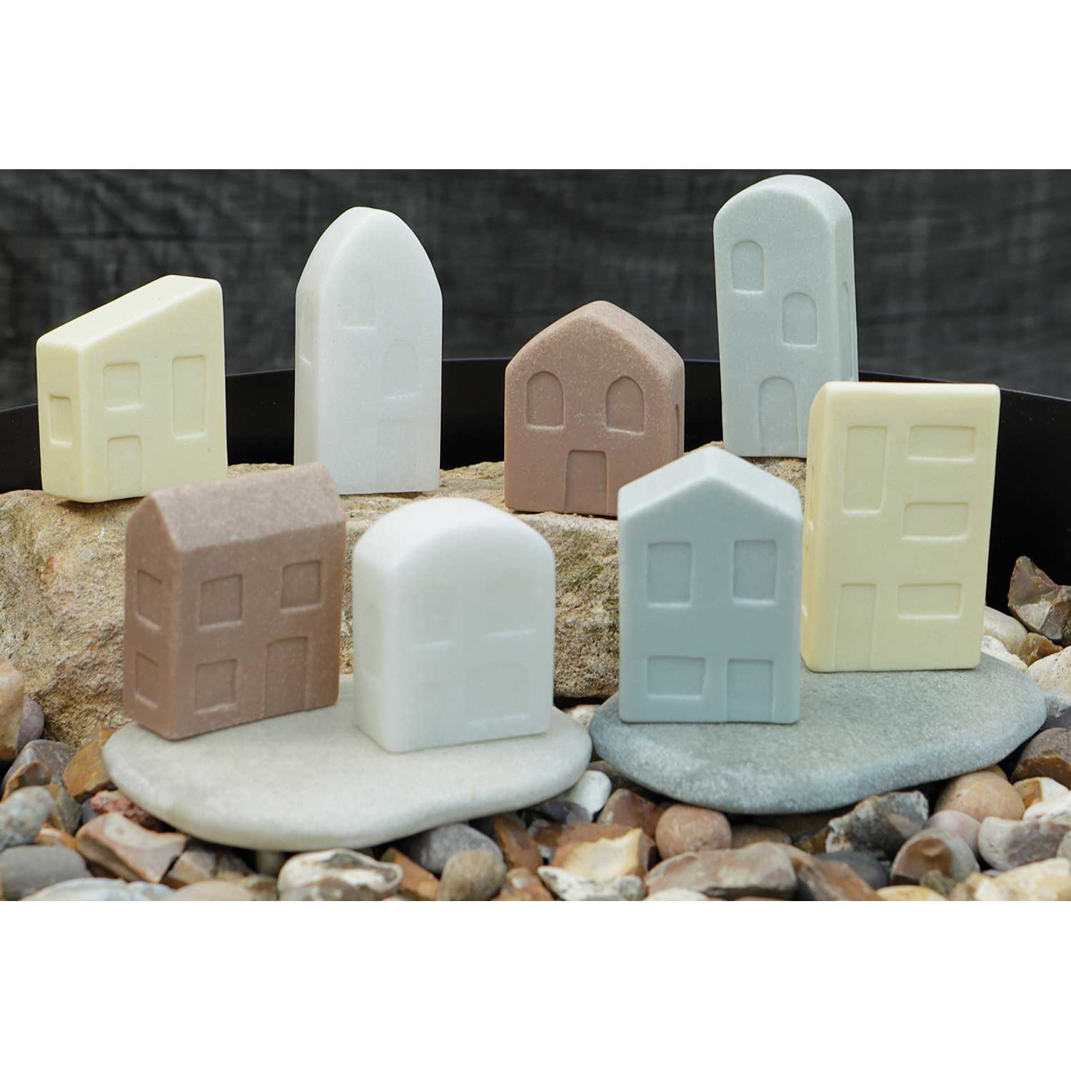 The Small World Homes are simple structures for sensational storytelling and small world play. These charming houses are a variety of natural colors and sizes with engraved windows and doors. Created using a durable stone mix, they are tough enough to use outdoors. Each set includes four pairs of homes, one small and one large, with different features and roof shapes.