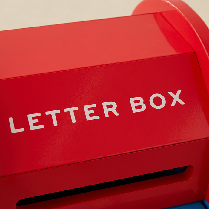 This wooden play set includes mailbox with letters, stamps, scale, and a canvas mail bag.