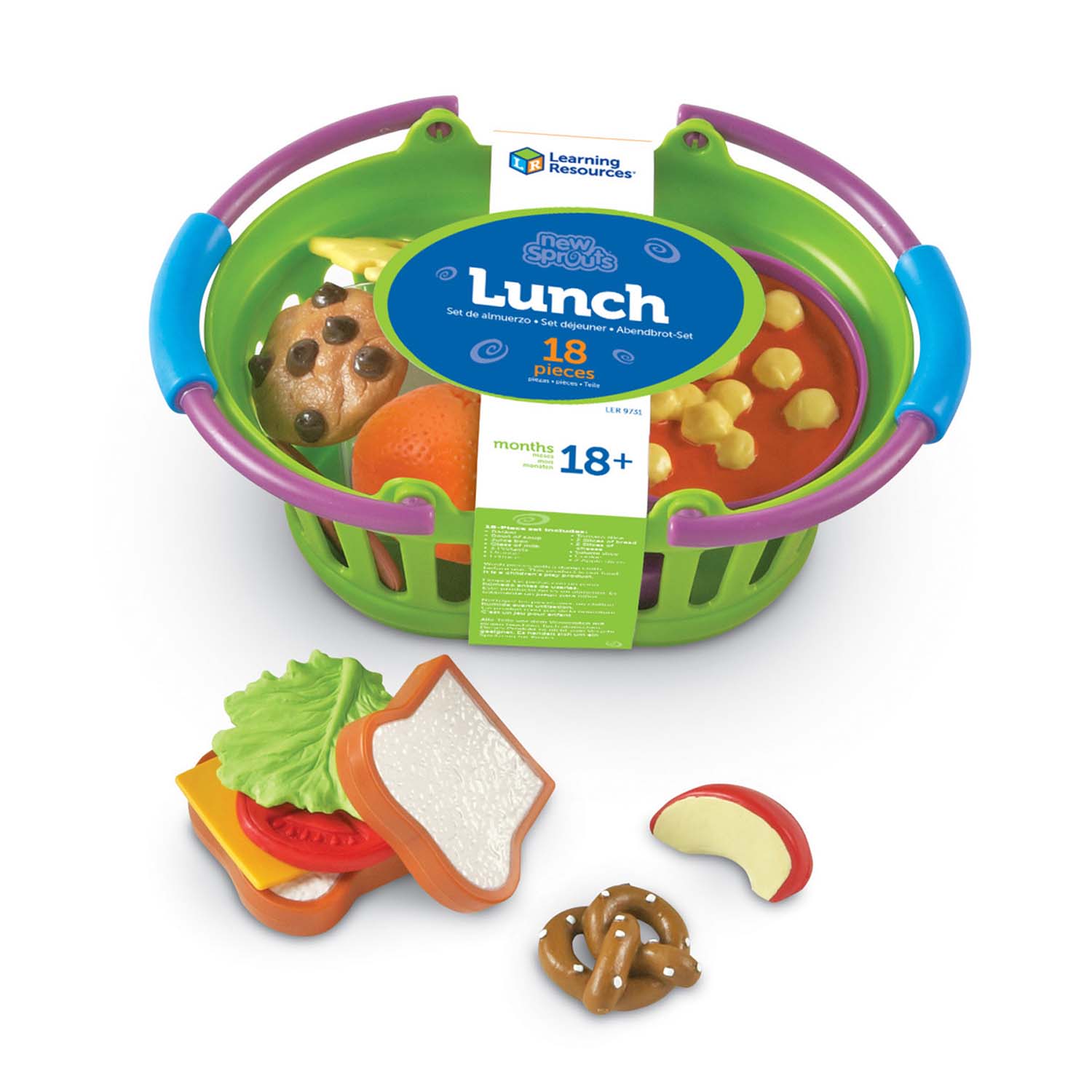 - Includes basket, glass of milk, juice box, soup in bowl, 3 mini pretzels, clementine, lettuce slice, tomato slice, 2 slices of bread, cheese slice, salami slice, swiss cheese slice, cookie and 2 apple slices