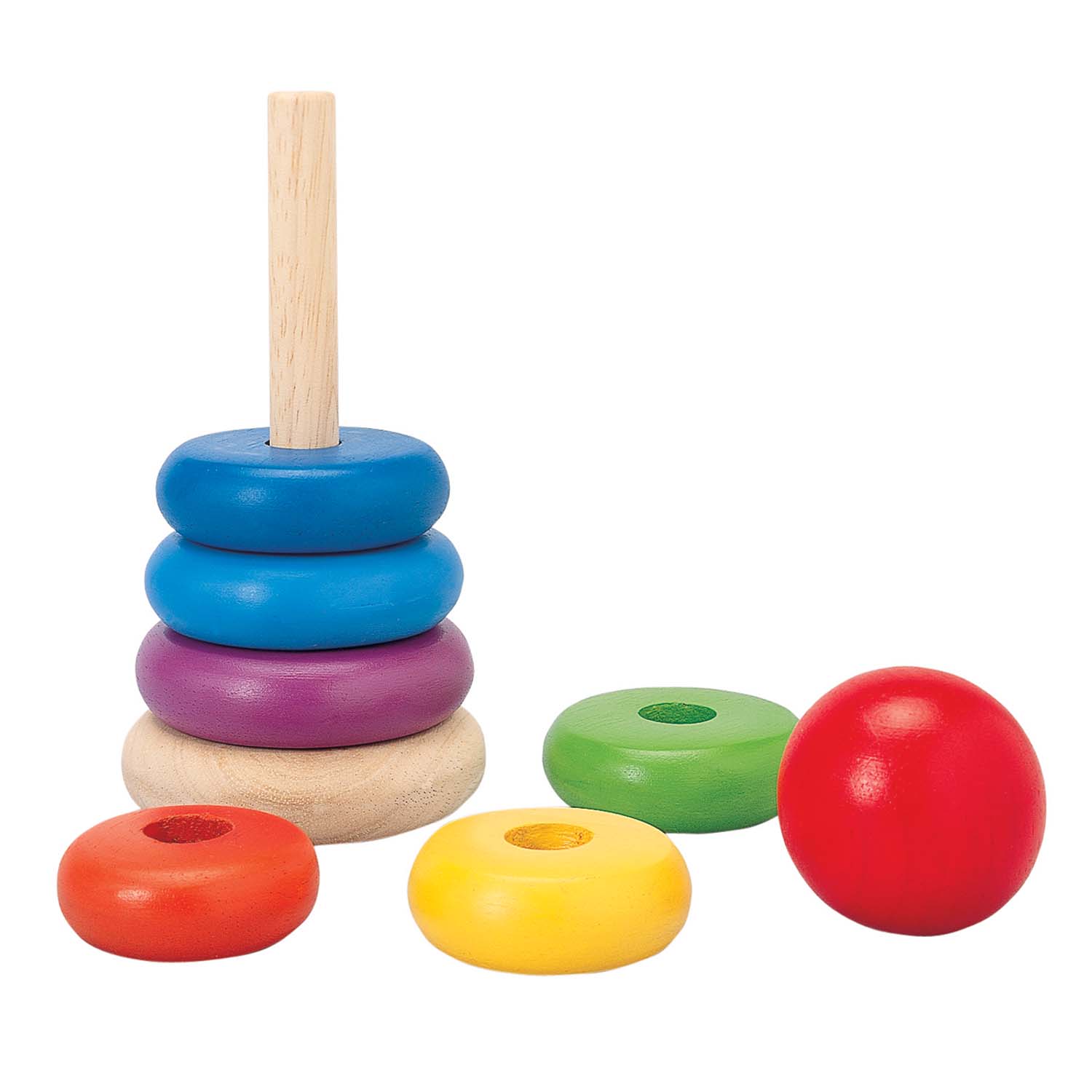 The wooden ring set to teach children about sizes and colors. As a safety precaution, the central rod is collapsible.