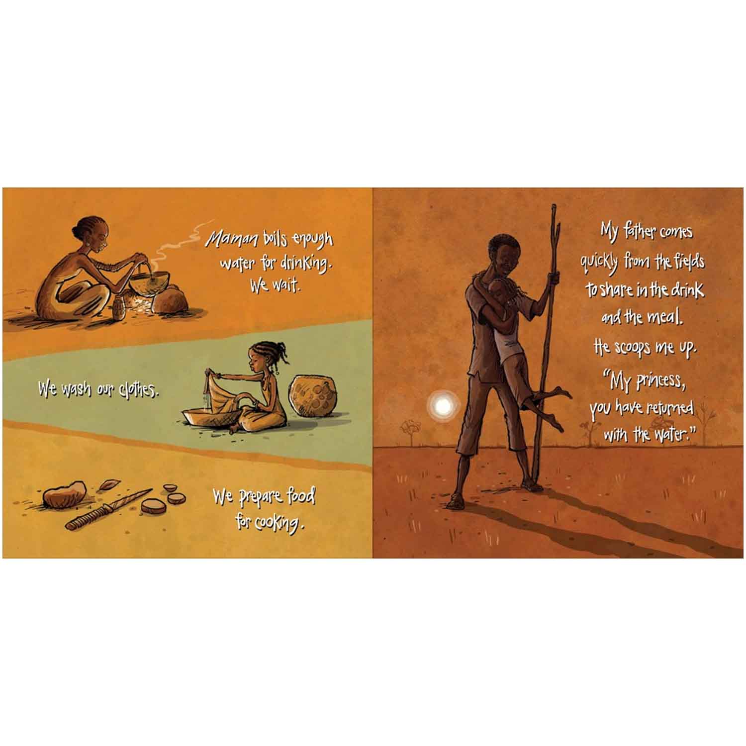 With its wide sky and warm earth, Princess Gie Gie’s kingdom is a beautiful land. But clean drinking water is scarce in her small African village. And try as she might, Gie Gie cannot bring the water closer; she cannot make it run clearer. Every morning, she rises before the sun to make the long journey to the well. Instead of a crown, she wears a heavy pot on her head to collect the water. After the voyage home, after boiling the water to drink and clean with, Gie Gie thinks of the trip that tomorrow will bring. And she dreams. She dreams of a day when her village will have cool, crystal-clear water of its own.