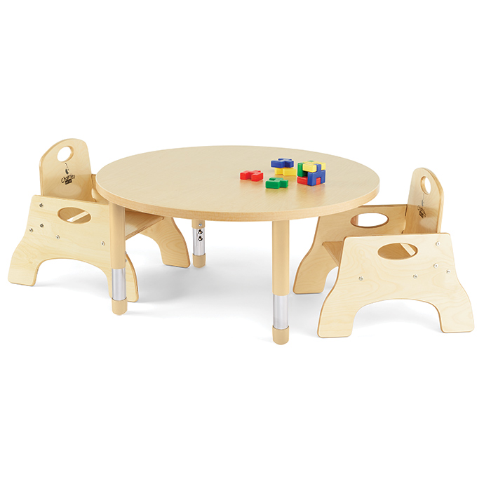 Perfect for tea parties and more! This 3-piece laminate table and chair set are sized just right with a table that adjusts from 14"-24" high. KYDZSafe®edges and finish.