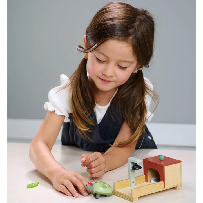 Tortoise Pet Set supports imaginative role play and care based storytelling with adult and baby tortoises, habitat, heater lamp, and food accessories. Scaled to fit Tender Leaf dollhouses for integrated small world setups. Durable wooden construction for early learning environments.