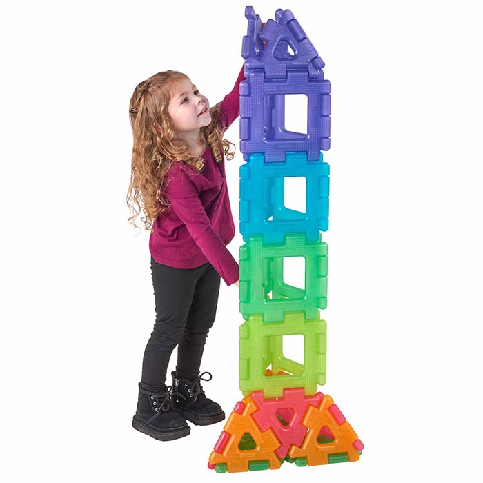 Create fun constructions with these colorful pieces that are easy for little hands to connect. The translucent colors add a whole new dimension to play when using the pieces outdoors in natural sunlight or with a light source. Suitable for both indoor and outdoor use. Includes squares (8") and triangles (6½").