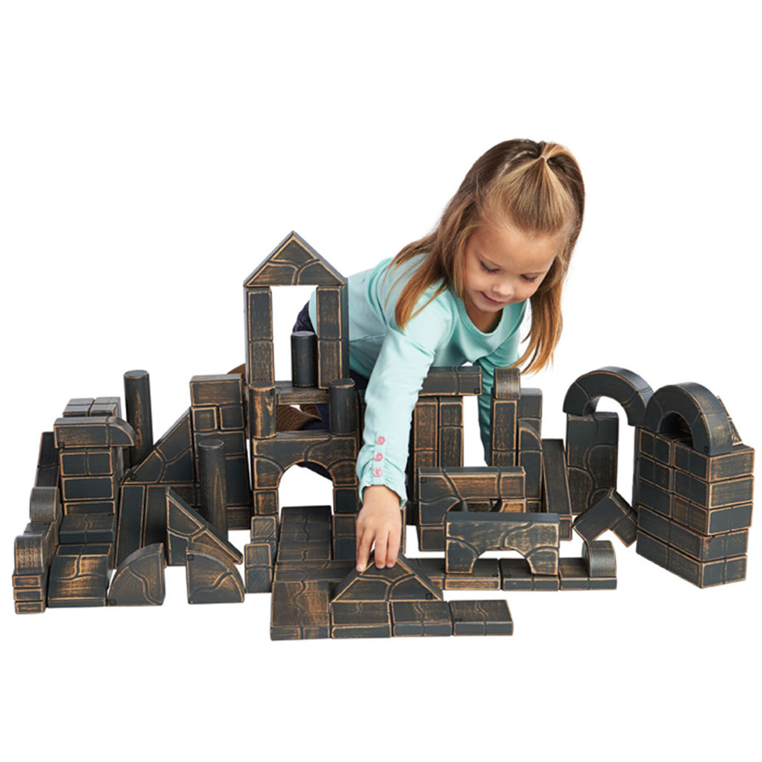100-piece set includes half units, full units, pillars, columns, gothic arches, buttresses, corners, roman arches, half circles, circle curves, triangles, thin units and more—a total of 19 shapes!